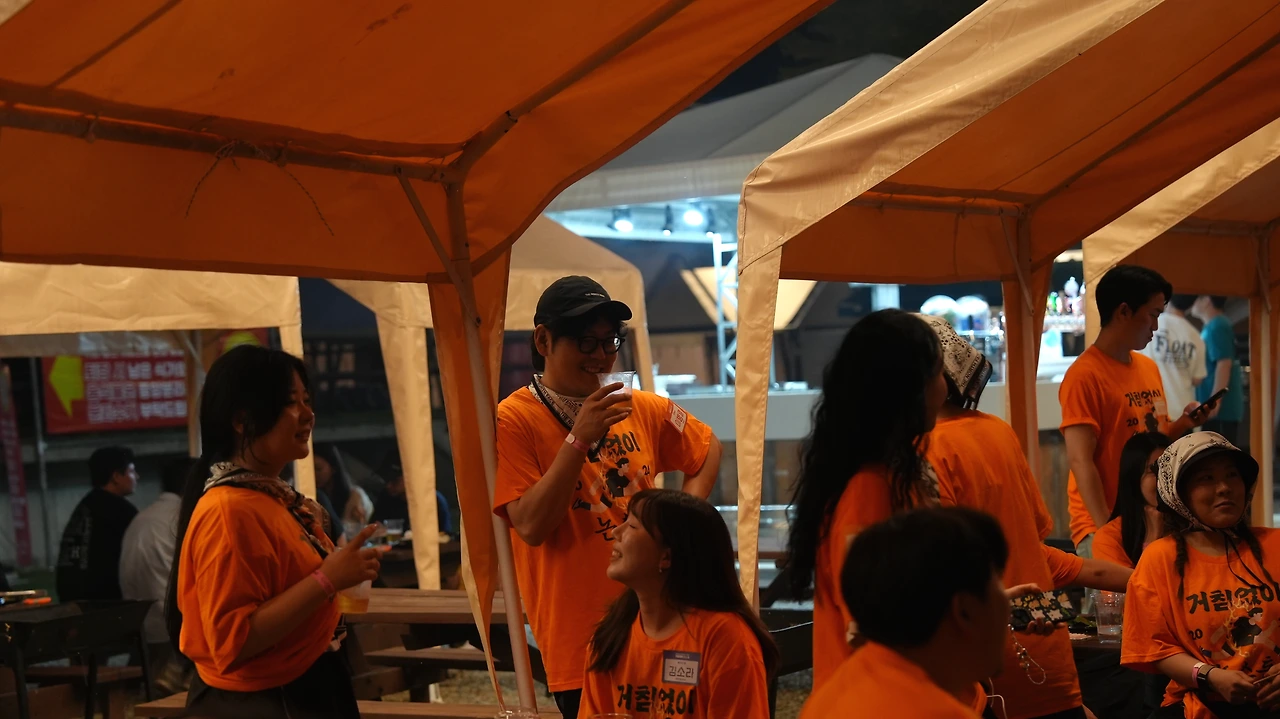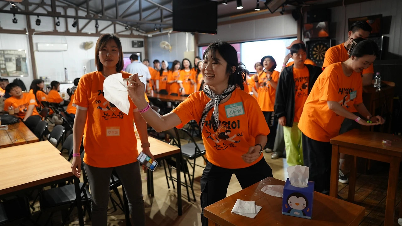 미니게임은 물병 똑바로 세우기, 공기 5개 한 번에 잡기, 떨어지는 휴지 젓가락으로 잡기, 그리고 머리로 스프링 세우기로 총 4가지 게임으로 구성됐습니다. 소소하지만 막상 해보면 재미있는 게임들로 준비했어요. 1번 게임을 성공해야 2번으로 넘어갈 수 있고, 만일 3번 게임에서 실패하면 1번부터 다시 시작해야 했어요. 그럼에도 많은 분들이 성공하겠다는 의지 하나만으로 줄을 몇 번이고 서셨답니다. (역시 의지의 오렌지들..!)