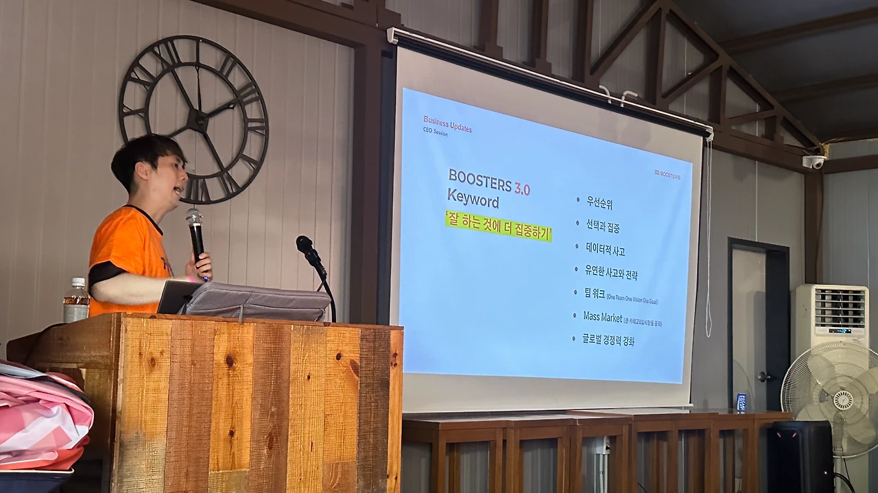 저희는 매달 갖는 부스터스 타운홀 미팅인 '부스팅데이' 날짜에 맞춰 워크숍을 진행하고 있어요. 회사의 방향성을 알 수 있는 주요 소식들을 전하고 신규 입사자들을 소개하는 자리입니다. 이번에는 윤호님이 지난 워크숍 이후 1년 동안의 변화와 앞으로의 계획에 대해 말씀해 주셨어요. 1년 사이 사업의 방향성에도 많은 변화가 생겼고, 매출과 인원도 그만큼 늘어났어요.