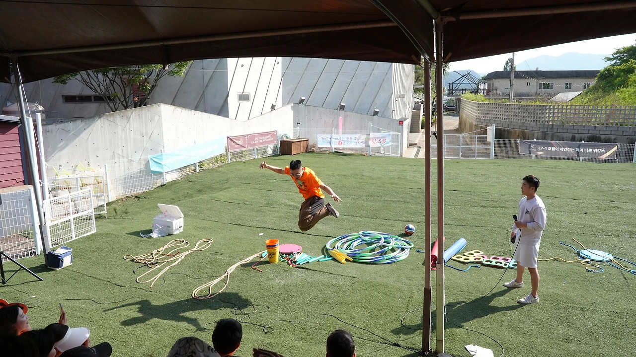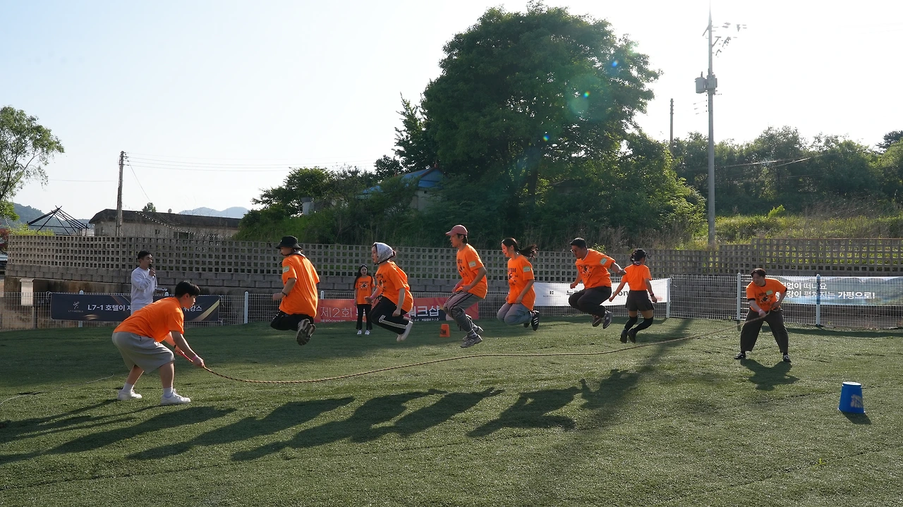 마지막은 부스터스 워크숍 공식 종목이 되어버린 단체 줄넘기였는데요. 긴 줄을 돌릴 힘이 필요한 것은 물론, 6명 모두가 같이 뛰고 착지하는 것이 생각보다 어려워 연습시간이 가장 많이 주어진 종목이었어요. 연습을 하며 줄을 돌릴 사람과 뛸 사람들을 정해 본 게임에 돌입했어요. 텐트 아래에서 순서를 기다리던 다른 팀들이 함께 카운트를 해주었습니다. 연습에선 잘했지만 본 게임에선 3번도 못하는 팀이 있는가 하면 연습과 달리 본 게임에서 실력을 발휘하는 팀도 있었습니다.