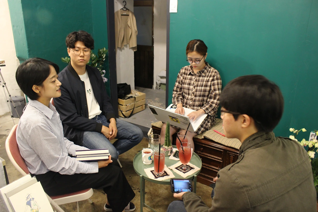 30분 정도 책방을 둘러보았다. 유리로 된 문, 직접 칠하셨다는 페인트 등 책방의 곳곳에는 주인 분들의 손길이 닿지 않은 곳이 없어 보였다. 정신없이 책방을 둘러보는 동안 서비스로 오미자 에이드를 타주셨다. 점점 어두워질 것만 같은 하늘 옆에서, 인터뷰를 시작했다.