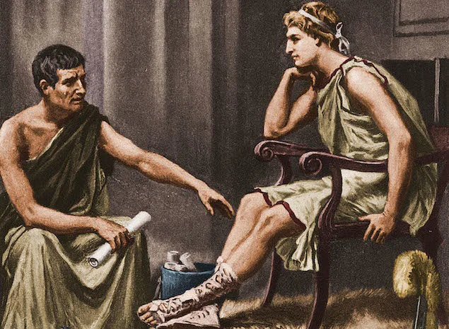 아버지 필리포스의 교육열도 만만치 않았다. 오히려 ‘문무’ 혹은 ‘지덕체’를 모두 강조했다는 점에서 올림피아스보다 한 술 더 떴다고 할 수 있다. 13살 때부터 3년간 알렉산드로스는 극기훈련의 ‘클래식’이라 할 수 있는 스파르타 방식의 혹독한 무예 교육을 받았다. ‘특전사’가 따로 없을만큼 철저히 실전에 대비한 강한 훈련 과정이었고, 이는 알렉산드로스가 우월한 위치에서 대군을 지휘할 수 있는 토대가 된다. 이와 동시에 철학, 정치, 역사, 자연과학 등의 분야에 관한 지식과 교양을 갖추기 위해 멀리 아테네에서 초빙한 ‘1타 강사’가 바로 그 유명한 아리스토텔레스이다. 요즘 식으로 말하면 필리포스는 그야말로 ‘타이거 대디’(Tiger Daddy)였다. 금수저에 일급 사교육이라는 익숙한 조합은 이미 그 시절부터 있었던 것이다.