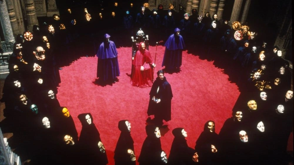 친구인 닉으로부터 우연히 알게 된 정보를 이용해 빌은 문제의 저택에 입장할 수 있었다. 대저택의 모든 사람들은 가면을 쓰고 있었고 중앙의 홀에서는 음산하고도 장엄한 분위기 하에서 고대 사회의 제사장을 연상시키는 남성이 주관하는 모종의 의식이 행해진다. 여러 평론에서도 언급했듯이 이를 프리메이슨(Free Mason)이나 일루미나티(Illuminati)와 연관된 의식으로 보는 견해가 설득력을 얻고 있지만 정확한 것은 밝혀지지 않았다. 제사장의 윤허(?)가 떨어지기가 무섭게 남녀들은 짝을 이루어 숨겨졌던 성적 욕망을 분출하기 시작한다. 가면을 쓰고 있기에 신분이 밝혀질 리도 없고 또 밝힐 생각도 없다. 그저 혼미해질 정도로 쾌락에 취해 이 밤을 불태울 뿐이다.