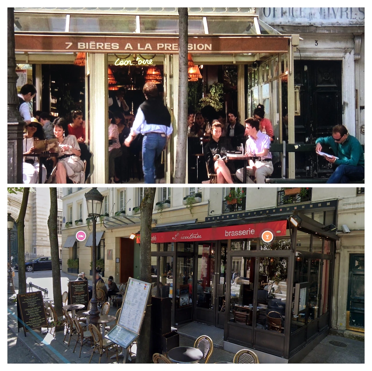여러 유럽 도시들이 그렇듯이 파리에도 오랜 시간 자리를 지키고 있는 상점들이 많다. 극중에 등장하는 소르본 대학 앞 레스토랑 L'ecritoire 역시 외관은 약간 변했지만 현재에도 존재하고 있다. 위쪽이 영화 촬영 당시의 1988년의 모습이고 아래가 2020년 현재의 모습이다.