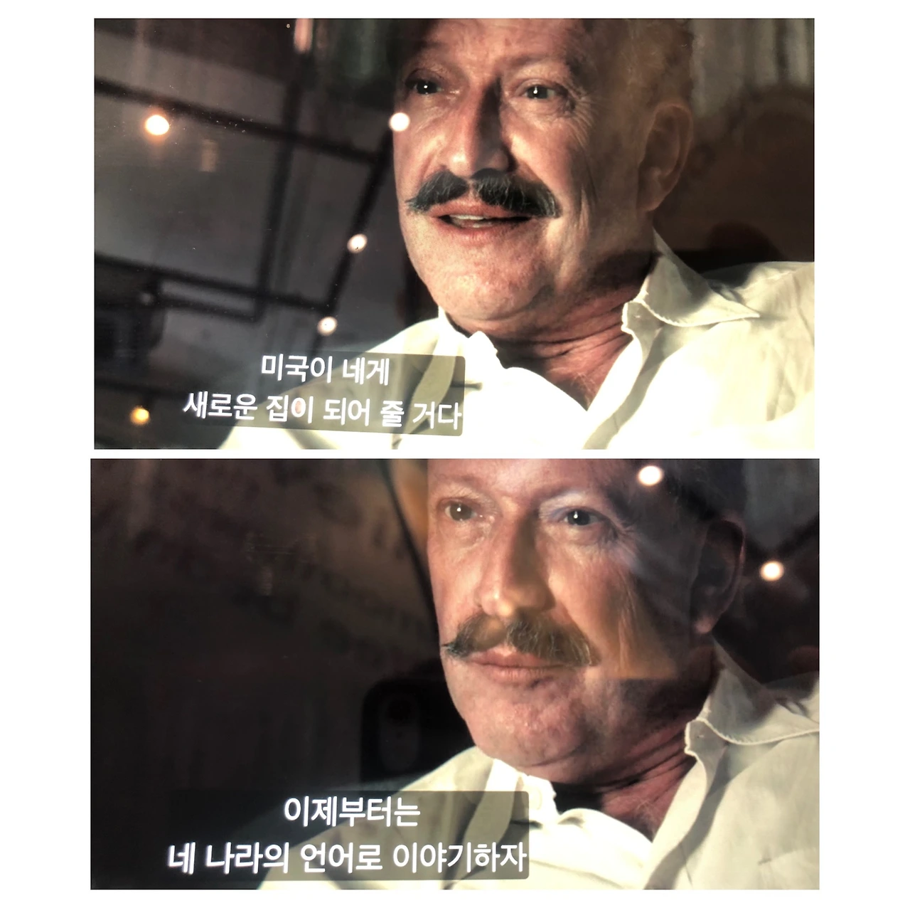 두 언어의 배열이 가장 극적으로 부각되어 빛났던 장면은 마리아가 빈을 탈출하기 직전 부모님과 나누는 작별 인사의 순간이다. 마리아의 아버지 구스타프는 건강이 악화되어 거동이 불편했지만 딸 앞에서 인자한 미소를 잃지 않는다. 부모를 두고 차마 발걸음이 떨어지지 않는 딸을 향해 아버지는 ‘옳은 일을 하는 것이다’라며 안심시키고 용기를 준다. 그리고 독일어를 중단하고 영어를 사용하며 미국에서의 딸의 미래를 축복한다. 이 장면에서 눈시울이 뜨거워지고 가슴이 먹먹하여 잠시 영화를 멈추고 깊은 한숨을 내쉬었다. 딸은 미국으로 떠나가 자유를 찾겠지만, 오스트리아에 남은 부모는 나치에게 핍박당하며 심지어 수용소로 끌려갈지도 모를 운명에 처해 있었다. 그럼에도 불구하고 그들은 그저 자식의 행복만을 기원할 뿐이었다. ‘행복한 추억과 (영원한)이별의 슬픔이 담긴 날들’에서 ‘시련을 딛고 희망을 노래할 날들’로 넘어가는 순간을 언어의 뒤바뀜이라는 메타포를 사용해 표현한 것이다. 아래 사진의 위는 독일어 대사이고 아래는 영어 대사이다.