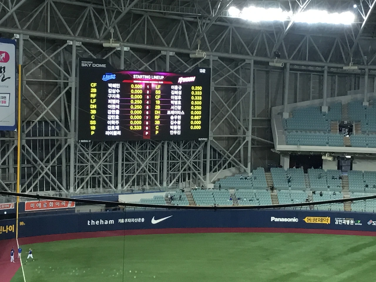 경기 시작에 즈음하여 전광판에 양 팀의 선발 엔트리가 소개되었고 홈팀 키움의 라인업을 응원단장이 직접 호명했다. 경기장의 스케일 탓인지 농구와 배구에서처럼 ‘암전 모드’에서 스포트 라이트가 비추는 가운데 달려나오는 ‘출정식’은 없었다(하긴 경기장 한복판까지 뛰어나오는 것도 보통 수고는 아닐 것이다).