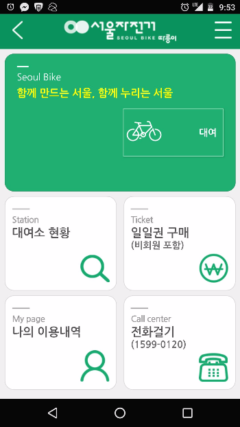 정말 황당했지만 일단은 자전거를 대여하는 게 주목적이니 대여하기 버튼을 찾아보았다. 가장 중요한 과업인 대여하기가 제대로 보이지도 않는다. 최소한 버튼의 색이나 위치를 적당한데 두어 찾기 쉽게 만들었어야 한다고 생각(아니 사실 확신)한다.