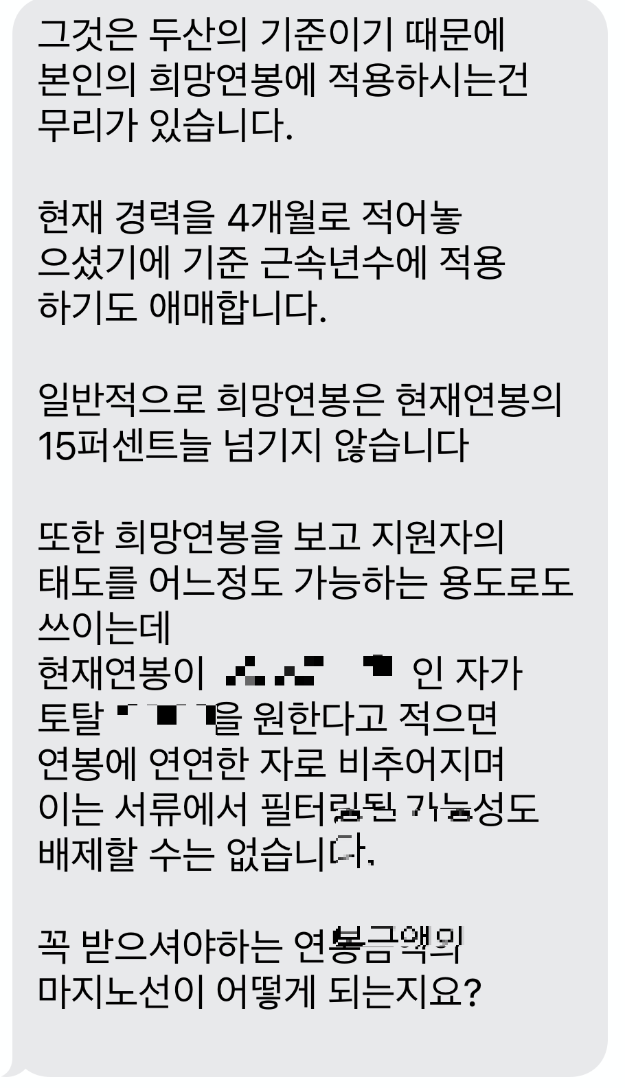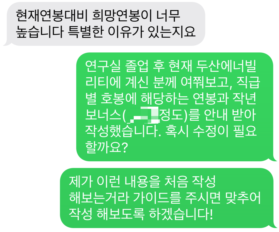 구구절절 말씀해주신 부분은 이성적으로는 다 이해가 됐다. 내 경력(대학원 생활을 포함하지 않은)이 너무 낮고, 연구실은 성과급같은 것이 없는데, 희망연봉란에는 내가 지원하는 부서에 계셨던 두산 선배에게 물어본 현실적인 연봉 및 성과급을 작성했더니 더더욱 큰 차이가 나게 된 것이다.