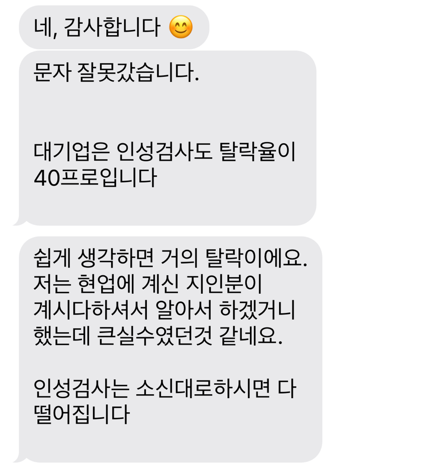 인성검사는 1시간이 주어졌고, 나와 같이 떨어진 형님은 약 20분 정도만에 모든 문항을 풀었고, 다른 친구는 이보다는 조금 더 걸렸다고 한다. 나중에 알게 된 사실이지만 인성검사에도 꿀팁이 있더라(!). 그리고 인성검사 결과는 시험 본 바로 다음날 아침, 이렇게 연락이 오게 된다.