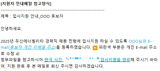 그리고 약 열흘 뒤, 두산에서 채용 절차를 진행한다는 연락을 헤드헌터사로 보내왔다. 헤드헌터사에서 내게 보내야하는 채용 절차에 대한 지원자 안내 메일 참고 양식도 함께.