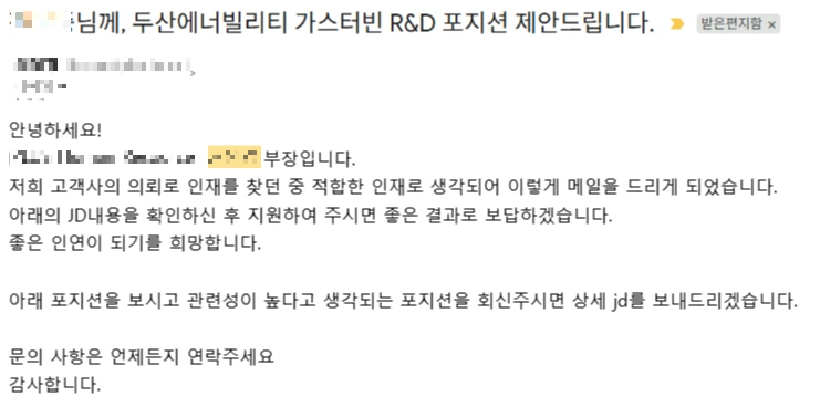 그렇게 내 지원서가 제출된 지 약 일주일 뒤, 그동안 헤드헌터사가 추천했던 수십명의 원서에 대한 검토결과를 두산에서 헤드헌터사로 전달했다. 즉, 합격자 명단 메일이 전달 된 것이다.