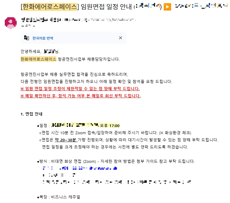 한화에어로스페이스의 임원면접은, 직무면접과 동일하게 온라인(줌 미팅)을 통해 보는 것으로 안내받았다.