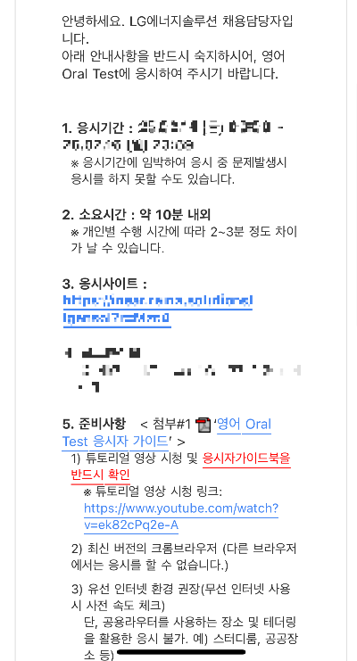 LG 에너지솔루션의 Oral Test는 TOEIC Speaking 기반의 시험(**2025년 1월 시험 기준이다**)이고, 내가 토익 스피킹 시험을 직접 봐본 것은 아니고 INEAR를 통한 일부 경험과 유튜브 강의를 통한 경험을 기반으로 했을 때는 더 어려운 시험이었다. (뒤에 좀 더 자세히 이야기 하겠다.)