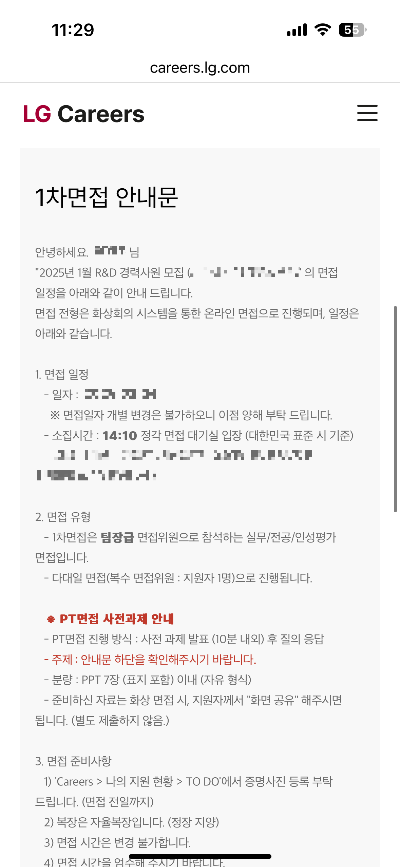 그렇게 1차 직무면접에 대한 안내문도 LG Careers에서 확인이 가능했다. (LG Careers가 이때 즘 개편이 되었는데, 점차 나아지고는 있지만.... 검색이나 로그인 등 좀 많이 느려졌다.)