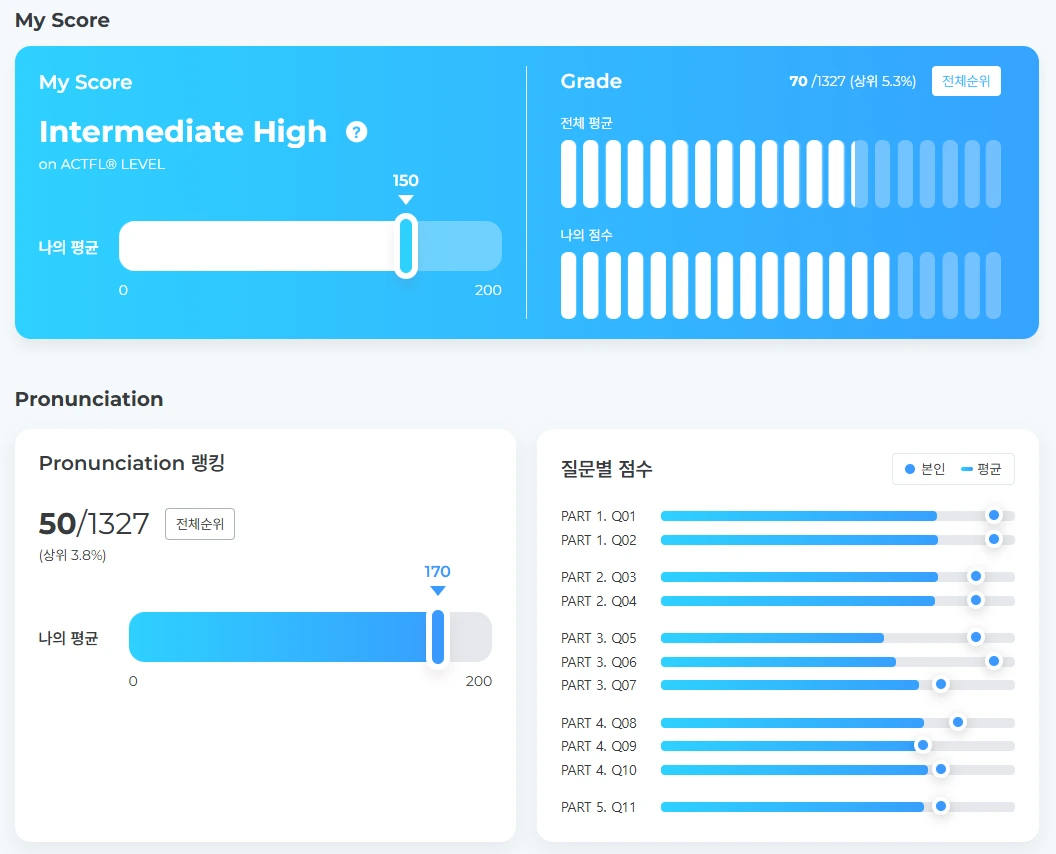 실제 플랫폼에서 시험을 봐보고 엔솔 평가를 보는게 좋을 것이라 판단해서 과감하게 5회 결제를 했다. 아침 먹고 시계토끼쌤 모의고사 1회 후 다시 INEAR 모의시험을 보고, 이렇게 이틀 간 모의시험을 돌렸더니 어떤 파트에서 어떻게 말해야할 지 감을 잡을 수 있었다. 문제라면 문제였던 것이, INEAR 시험은 파트 5까지 꼭 봐야 성적을 볼 수가 있는데, 파트 4, 5가 가장 어렵다(!!!!). 그래서 나온 성적이 의미가 있을까 싶기는 했지만, 최선을 다해서 문제를 풀어봤다. 어차피 말하기 연습인 거니까.