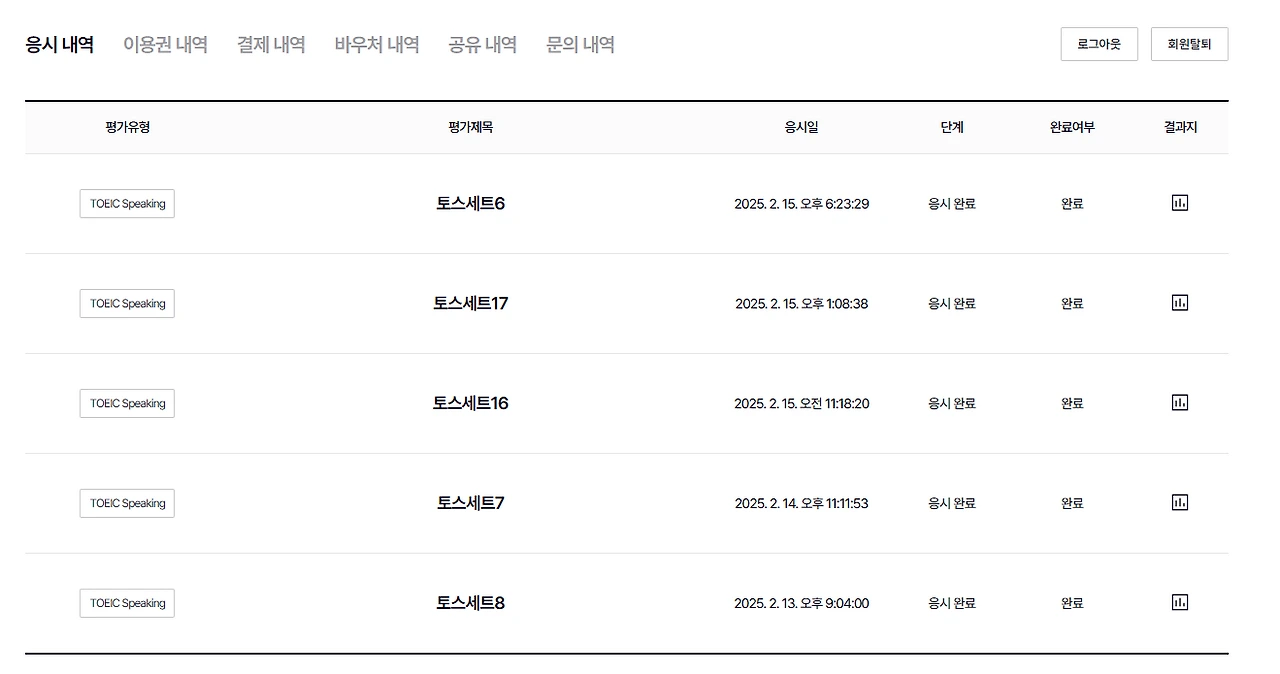 나 때는 INEAR에서 1회 체험응시같은 것이 가능했는데, 지금은 이용권 증정 이벤트 같은 것만 하고 있더라. 나는 1회 응시권을 사용해서 먼저 체험을 해보고 실제 5회 이용권을 결제해서 사용했었다. 이 경험이 정말 많은 도움이 되었다. 아마 토익스피킹 시험을 치는 여러 학생들에게도 추천하고 싶다.