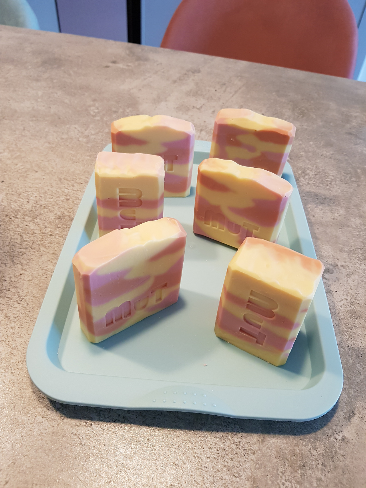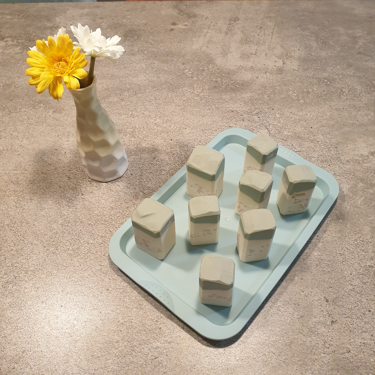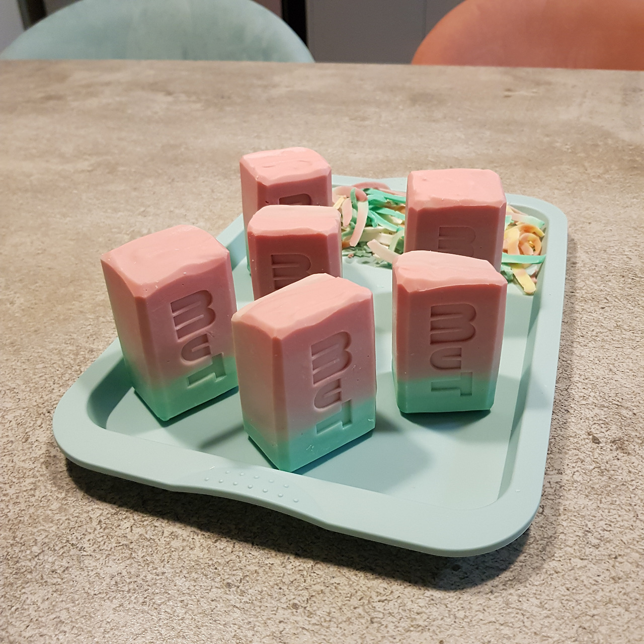 1. Melt-Pour 는 굳어있는 비누 베이스를 녹이고 색을 입혀 다시 굳히는 방법이다. 녹인 비누는 다양한 색을 첨가하여 실리콘 몰드에 담아내는데, 기성 몰드에 녹여서 한 번에 비누를 만들기도 하고, 비누곽같은 직사각형 비누틀에 색도 양도 마음대로 옮겨담아 만들기도 한다. 이런 MP 비누는 쉽게 굳기 때문에 바로 꺼내서 사용할 수 있다.