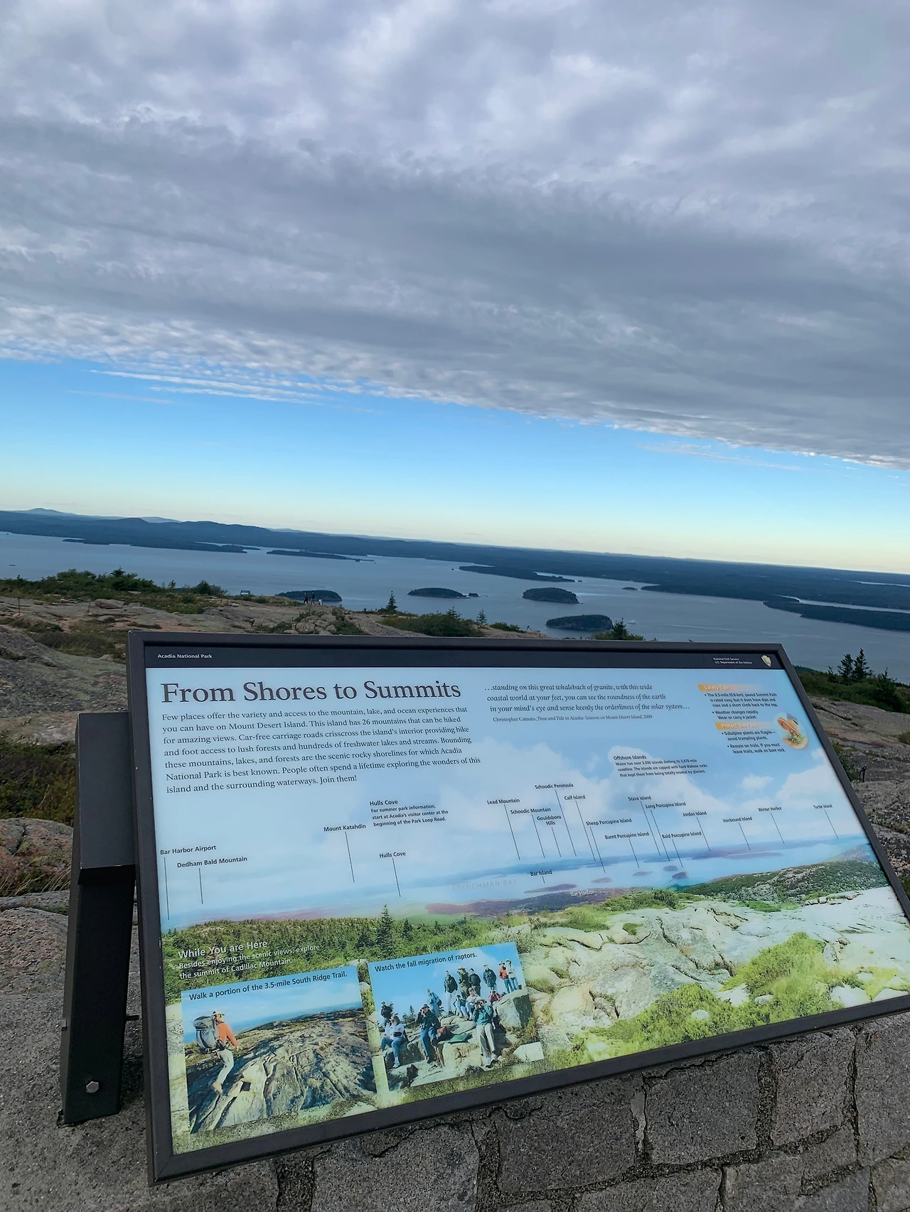 벌벌 떨며 올라왔지만 오길 잘했다는 생각이 들었다. 여기가 바로 아카디아의 화룡점정(畵龍點睛)이었다. 한눈에 국립공원의 매력적인 면면을 확인 할 수 있었다. 캐딜락은 우리 같이 시간이 부족한 사람들이나 아카디아 여행을 마무리하는 사람들이 필수로 들러야 할 곳이다. 차 안에서 찔끔 보이는 그깟 절벽이 무서워 이 멋진 풍경을 놓칠 뻔했다니. 나에게 꿀밤이라도 한 대 때리고 싶은 심정이었다.