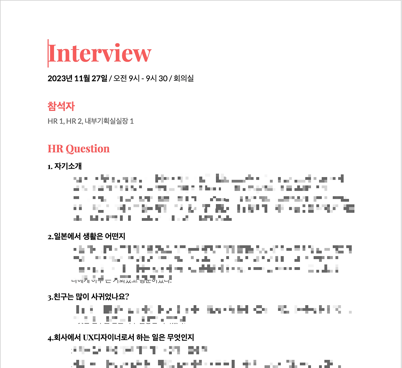 인성면접처럼 보이는 회사 생활 전반에 관한 질문(by HR team) + 과거 직무경험과 앞으로의 직무에 관한 질문 (by 부서실장)