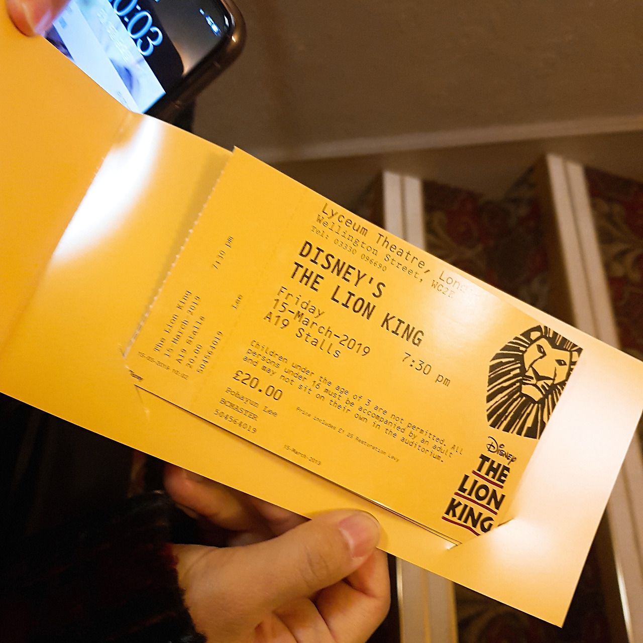 그렇게 우리는 데이 시트 성공! 맨 앞자리 좌석을 받았다. 런던에서 뮤지컬이라니.. 그리고 라이온 킹은 제일 인기 있는 뮤지컬 중에 하나라던데.. 너무 기대된다!