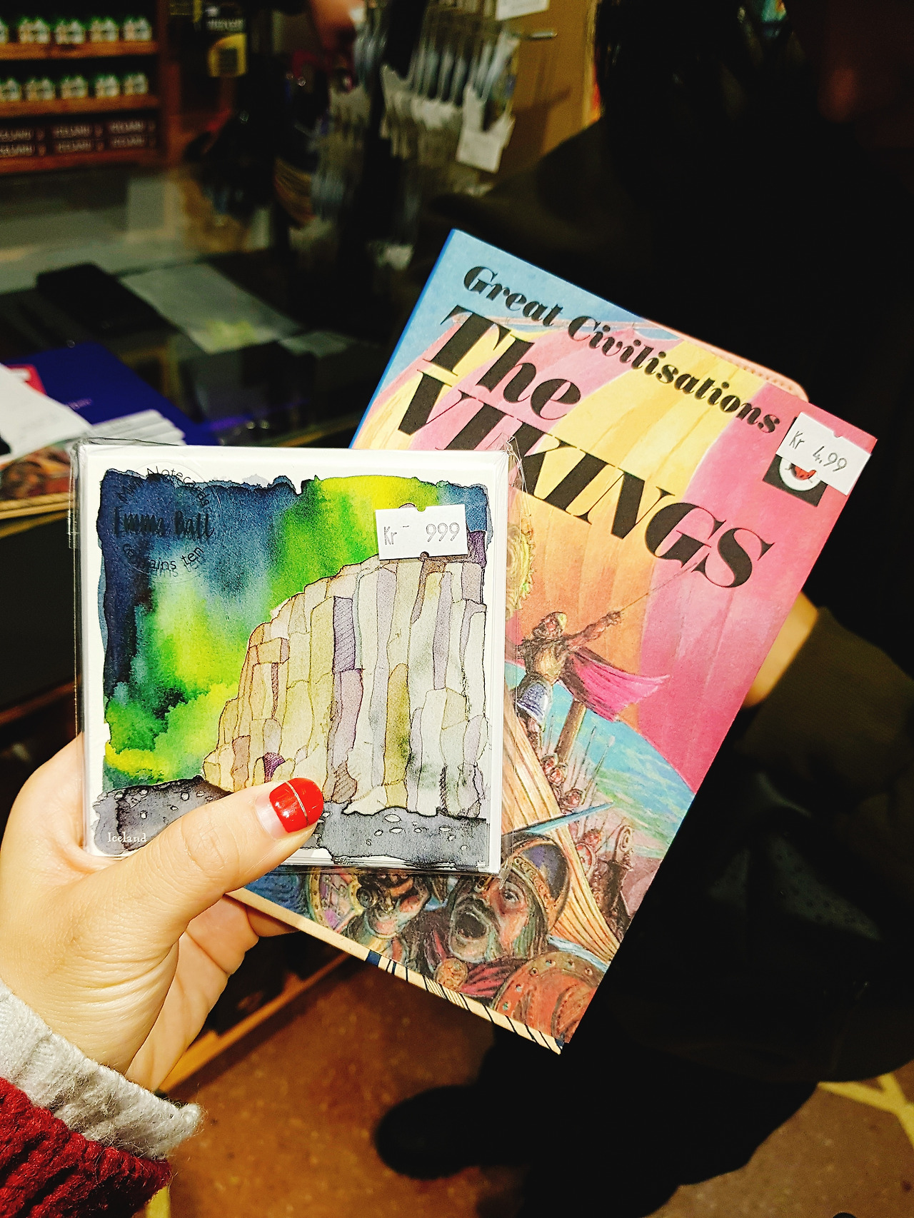 레이캬비크의 상점가는 아주 아기자기하다. 높지 않은 건물 1층에 주변보다 밝은 불빛으로 반짝이 것은 물론이고, 내부에 귀여운 북유럽풍의 소품들이 ‘나를 데려가 줘’ 하고 유혹한다. 아기자기한 소품들을 보면서 혼이 빠진 우리는 수많은 상점들을 지나며 사진을 찍고, 몇 군데는 들러서 기념품을 구매하였다. 사고 싶은 기념품들이 너무 많았으나, 우리는 절대로 짐이 늘어나면 안 되기에 비교적 무게와 부피가 적게 나가는 기념품을 골랐다. 나는 엽서와 그림책을 뽀는 자석과 그림책을, 구매한 뒤 기념품들을 가방에 담았다. 이 작은 기념품들이 얼마나 비싸던지 새삼 아이슬란드의 물가를 알 수 있었다. 하지만 이 작은 기념품들이 주는 만족감과 기쁨은 이루 말할 수 없었다.