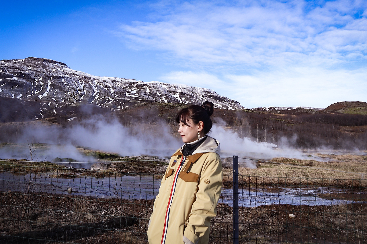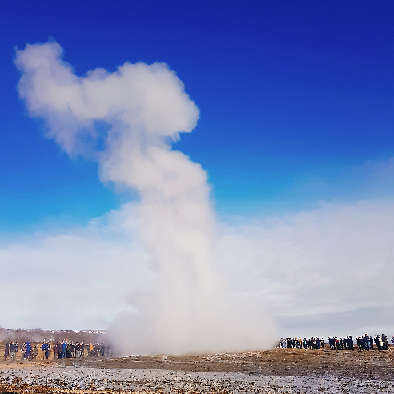 땅에서 연기가 피어오르고 있었다. 그중에 사람들이 잔뜩 모여 있는 곳에서 기다리니 '펑!' 하고 물과 연기가 높게 솟아올랐다. “와...!” 다들 탄성이 나왔다. 2번 정도 지켜보니 이제 언제쯤 솟아오를 거라는 감이 왔다. 여러 번 지켜보면서 폭발하는 광경이 익숙해질 만도 한데, 생각보다 큰 폭발이 솟아오르면 다시 놀랍기만 하다. 폭발하는 때를 기다리고, 때맞춰 포즈 잡으며 사진 찍는 사람들 구경도 재밌다.