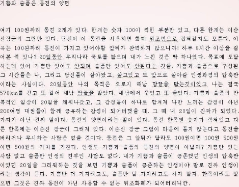 2009년 여름 나는 20일 간 국토대장정을 갔다 왔었다. 그 해 내 인생 최고의 사건이나 다름없었던 바, 경험한 바를 가장 충실히 작문 주제에 녹여낼 수 있었다. 물론!! 잘 썼다는 말은 아니다.