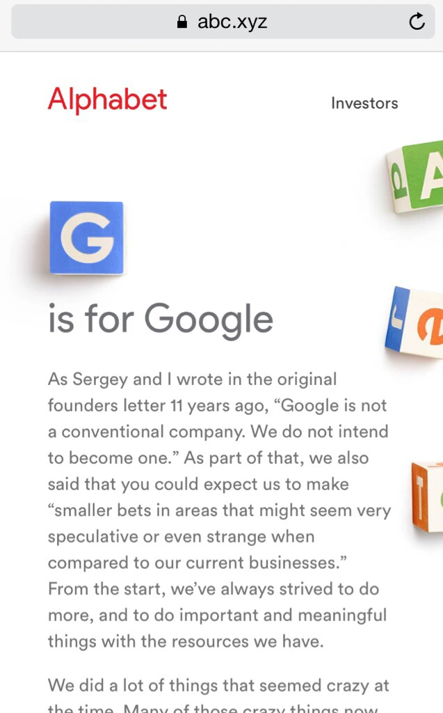 구글이 지주 회사를 설립하고, 구글은 새로 출범하는 지주회사의 자회사로 편입한다고 발표했습니다. 이 발표 때문에 구글 창업자인 세르게이 브린과 래리 페이지는 창업하고 11년 만에 ‘창업자의 편지’를 썼습니다.