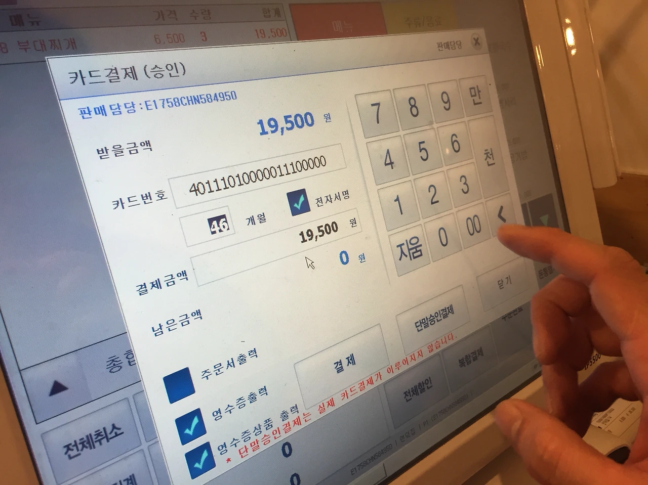 어랏? POS에 46개월 할부가 찍혔다. 으잉?? 카드번호는 16자리를 훌쩍 넘겨 카드번호 칸을 숫자로 가득 채웠다.