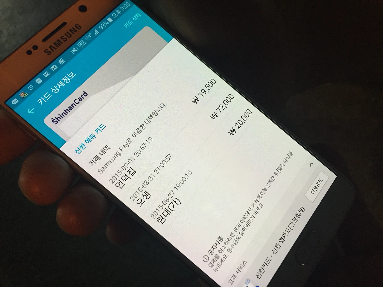 "이렇게 삼성페이 보여달란 사람들한테 시연하다간 내가 죽겠어. 봐, 이틀에 십만 원 썼어. 이제 지갑 안 가지고 나왔다는 말이 안 먹혀. 킬러 앱이야 ㅜㅡ ㅜ"
