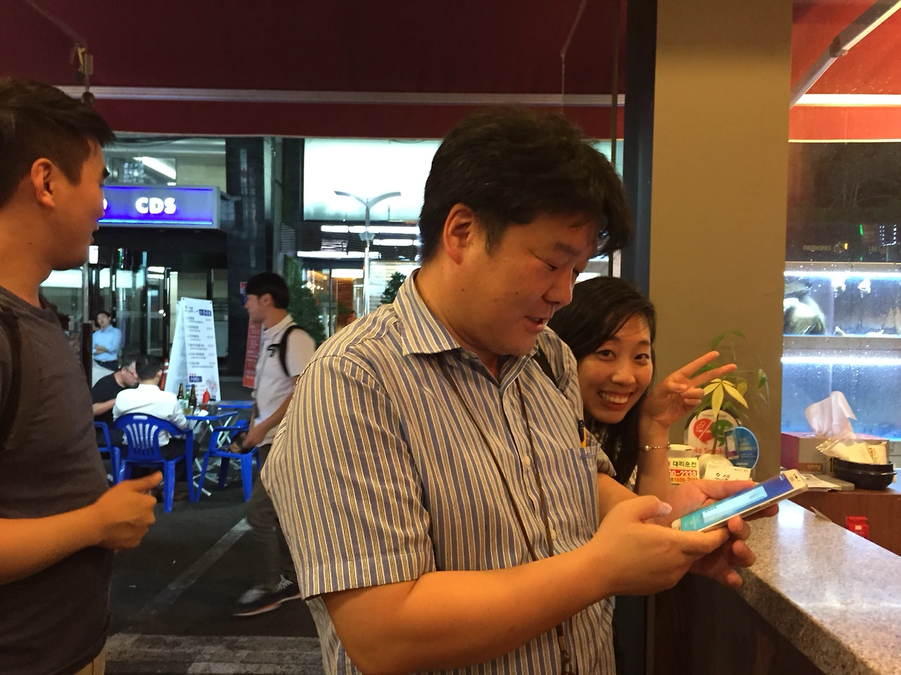 그래서 우린 횟집으로 갔다. 이왕 쓰는 거 배도 채울 겸. 우럭쌈정식에 활어회 세트 3번을 시키고 왕창 수다를 떤 다음 자리를 뜰 때가 되었다. 다들 자기의 폰을 카메라 촬영 모드로 바꾼 뒤 우르르 계산대로 갔다. 왼쪽, 오른쪽, 뒤에서 비디오, 사진을 찍어 댔다.