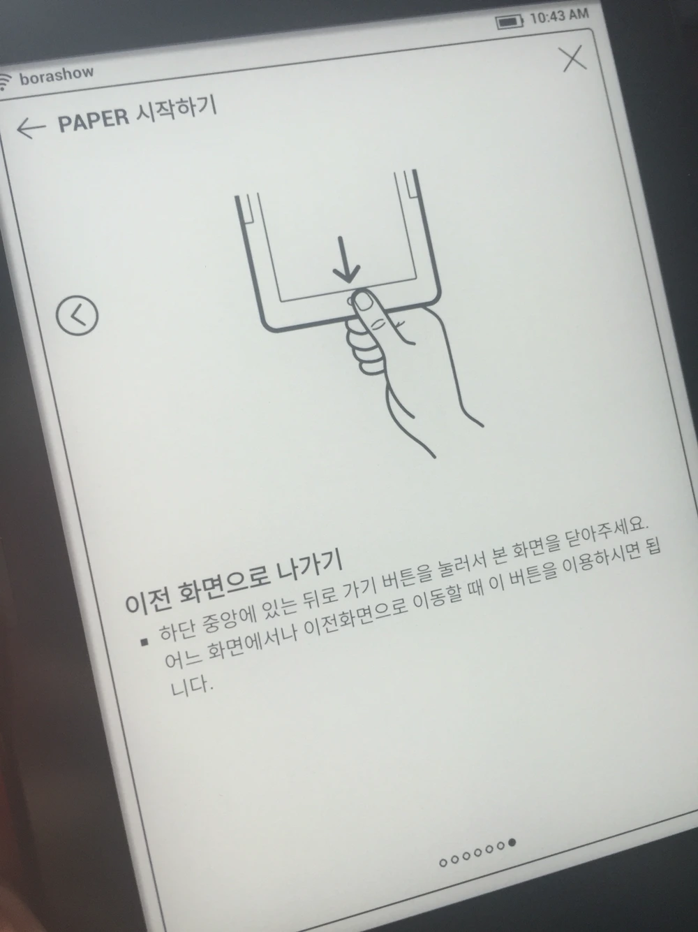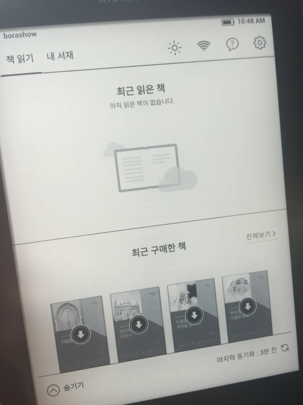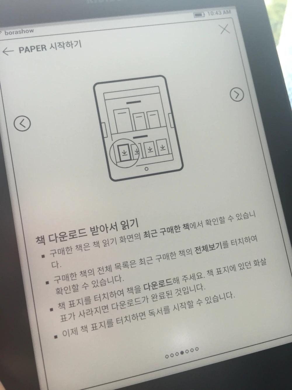 사용법을 알리는 화면이 나옵니다. 리디북스에 로그인하고 나선 홈 화면이랄 수 있는 서재가 나옵니다. 화면 아래 가운데에 있는 홈 단추를 짧게 터치하면 이 화면이 나오게 됩니다. 이렇게 켜고 나니, 첫인상은 스마트폰이나 아이패드용 리디북스 앱과 비슷한데 색이 빠진 느낌입니다.