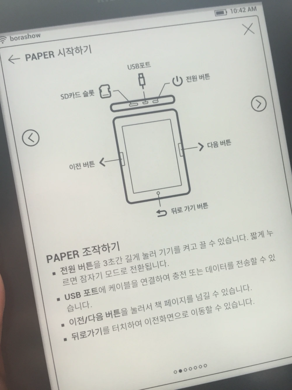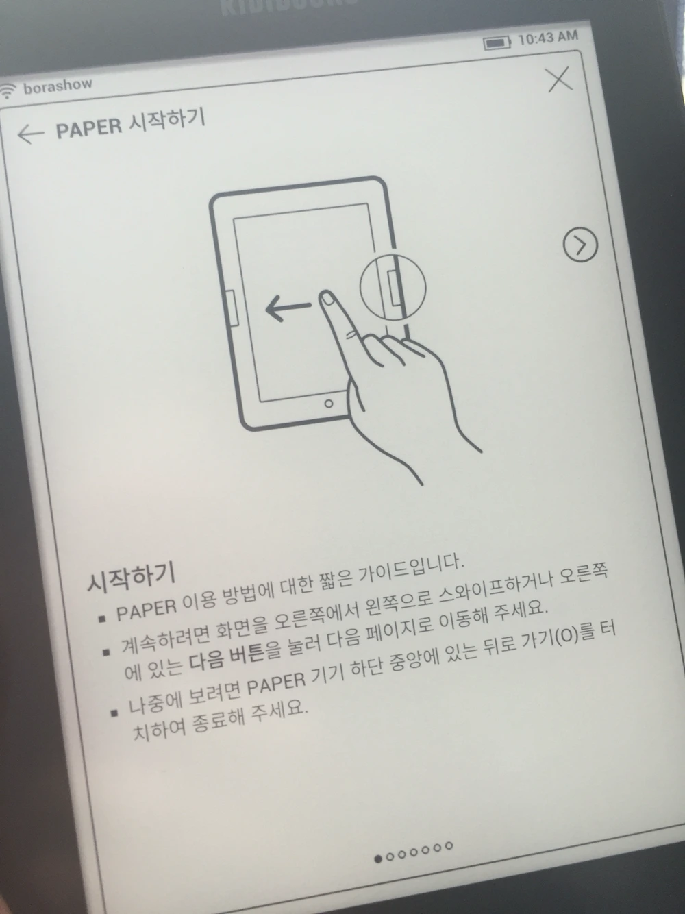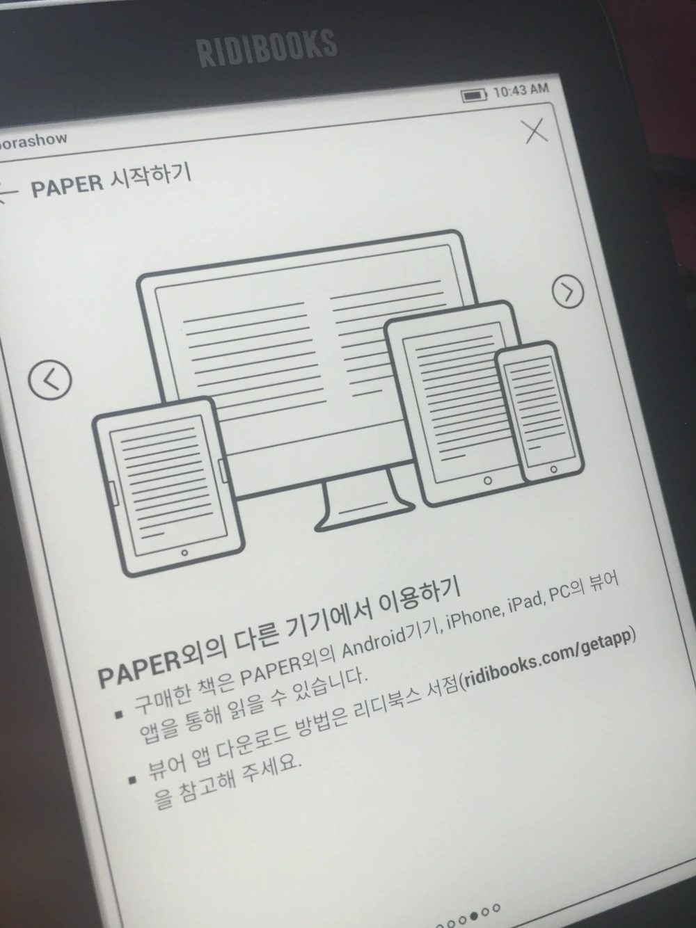 리디북스 페이퍼는 화면 양 옆에 페이지를 넘기는 단추가 달렸습니다.