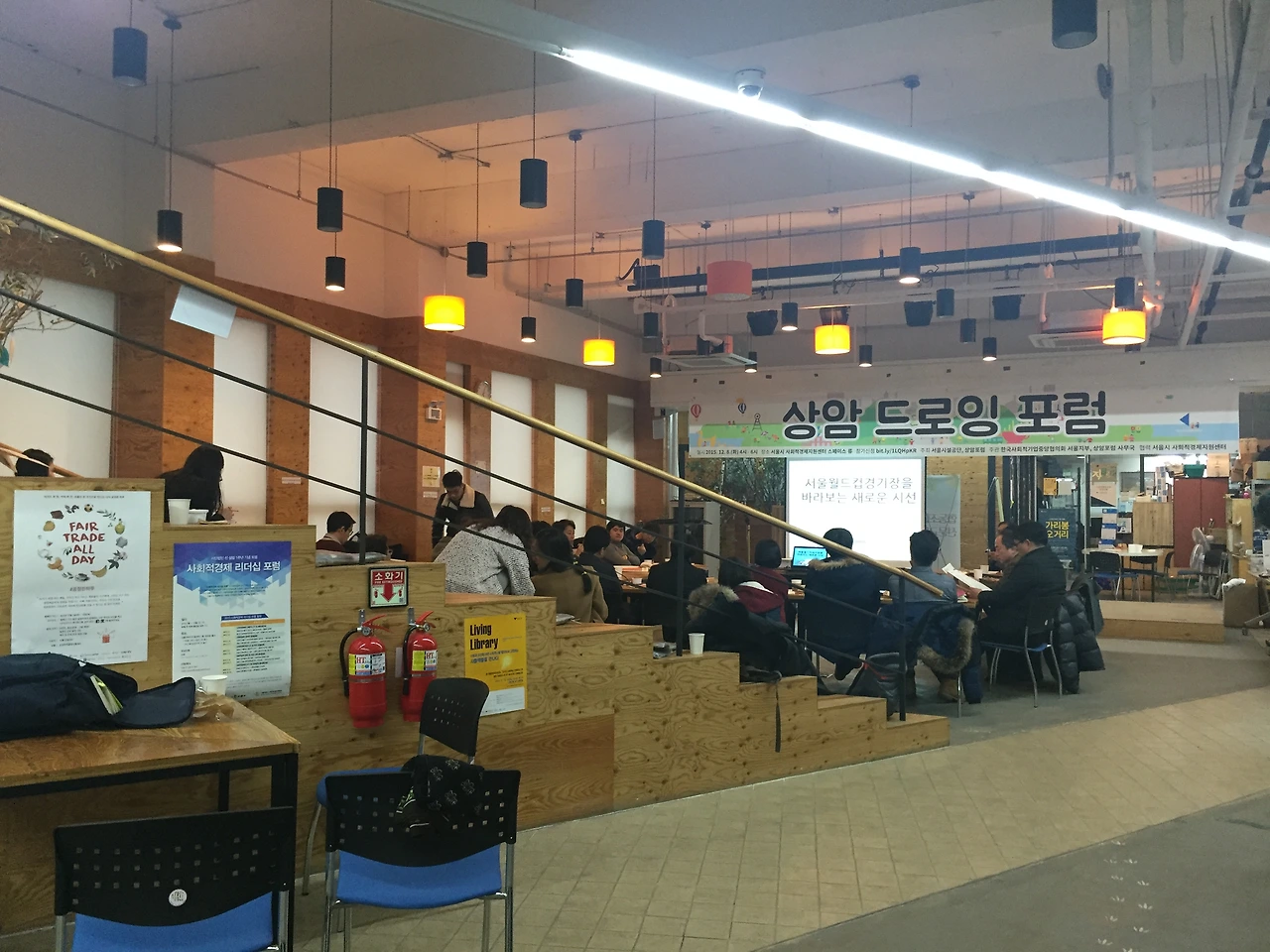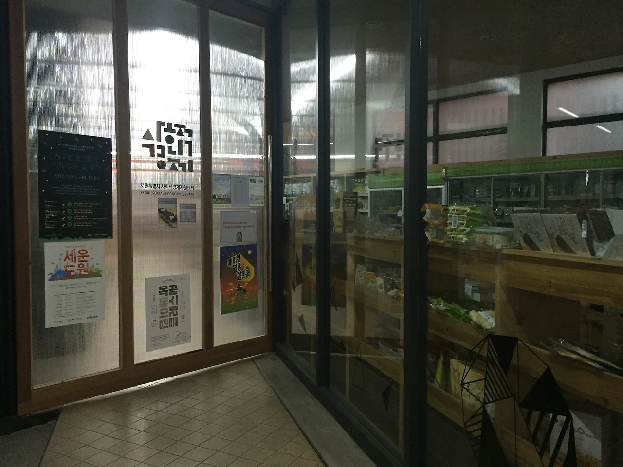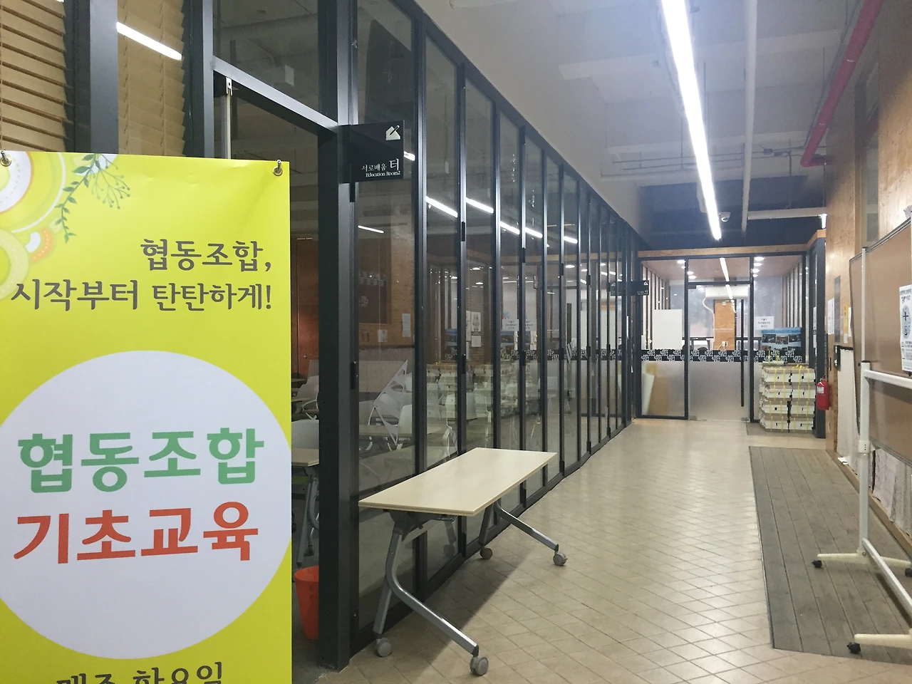 저는 비영리IT지원센터가 있는 서울시 사회적경제지원센터를, 청년허브의 청년카페를 통과하여 들어갔습니다. 초행인 제게는 그 공간이 미로 같았는데요. 아래 지도가 있는 벽을 지나면 서울시 사회적경젱지원센터로 들어가는 문이 나옵니다.
