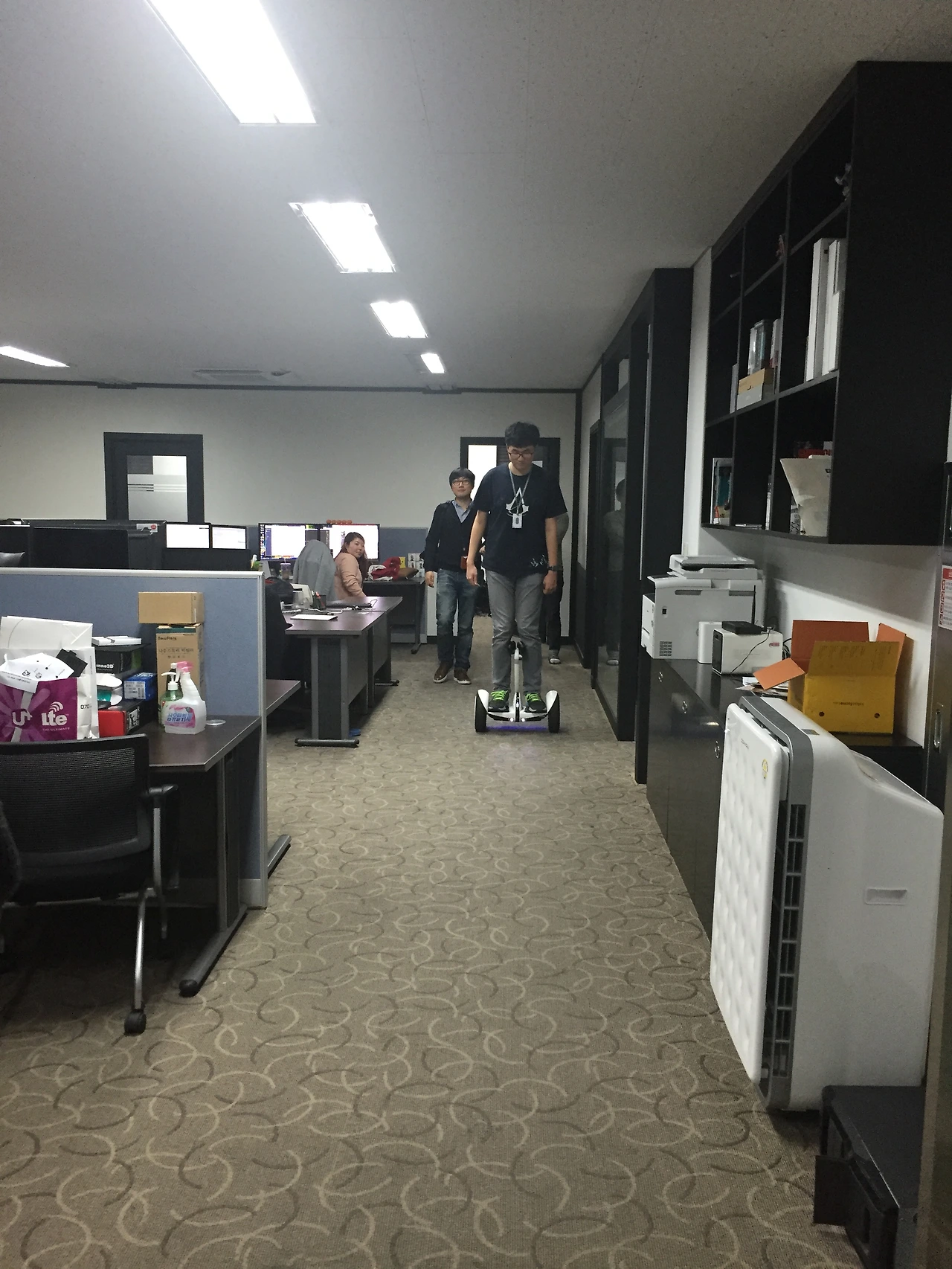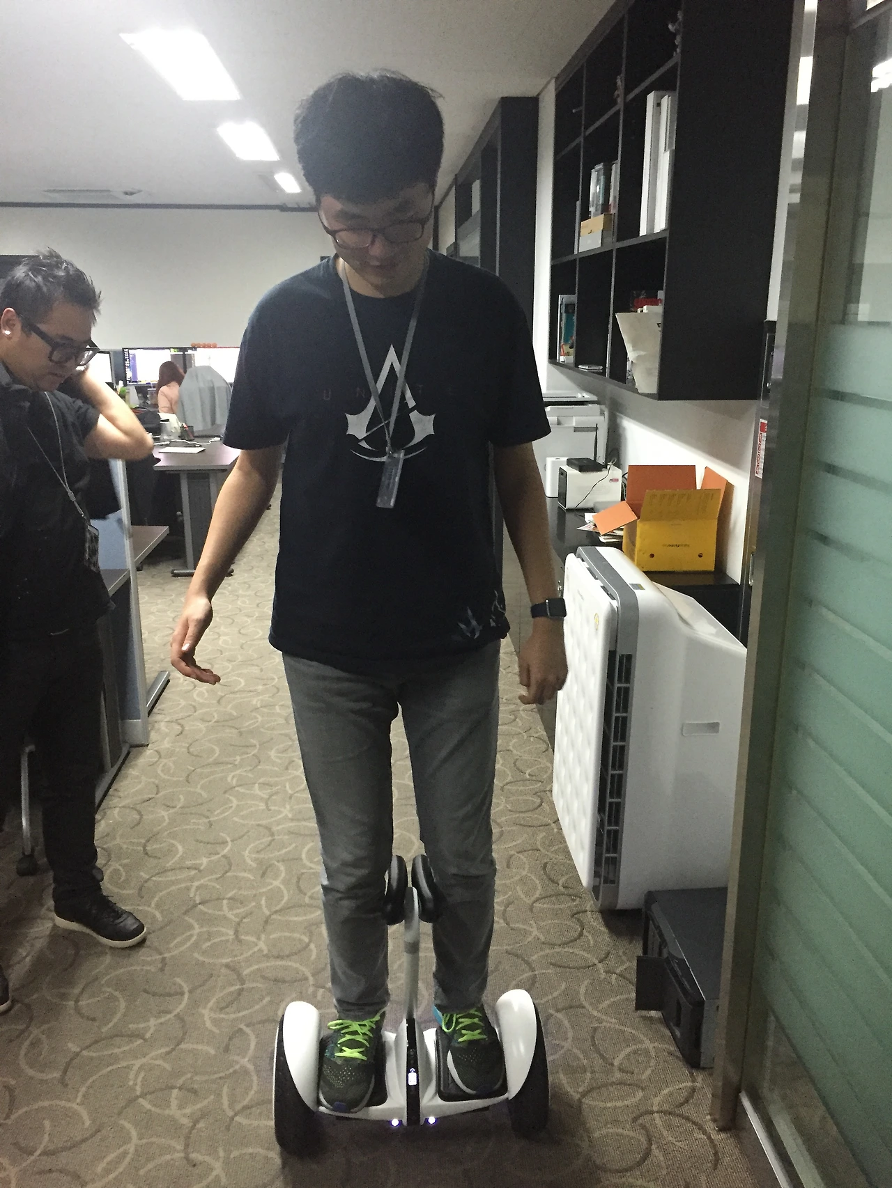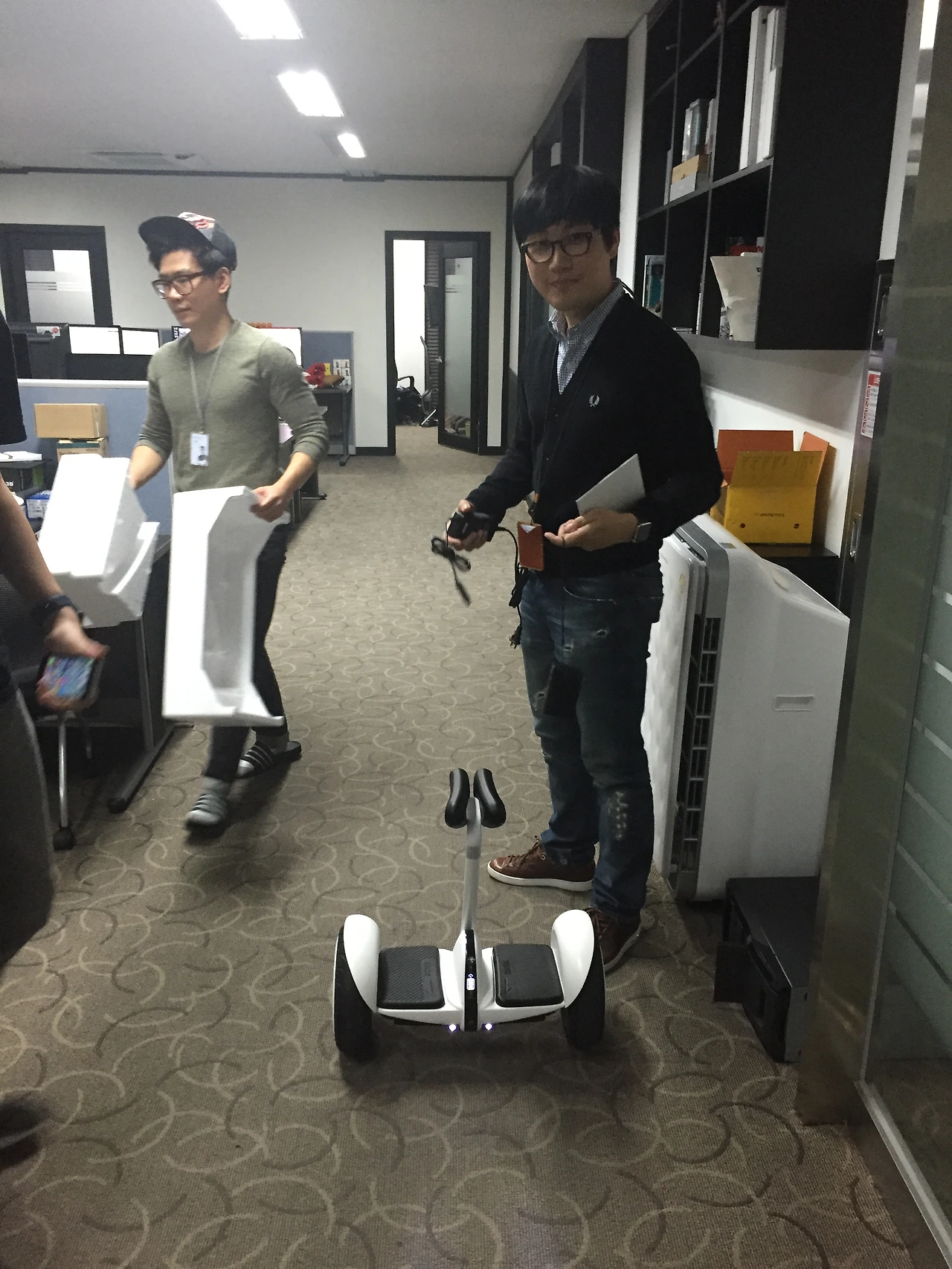 제가 더기어에 놀러간 날 샤오미 나인봇미니가 도착했습니다. 제가 갔을 때엔 개봉기 영상을 찍고나서 돌아가면서 한 번씩 타본 뒤였습니다. 귀염둥이 IT 리뷰어인 쿠도쿤 @kudokun_ 이 인턴기자로 있는데 시연을 해보였습니다.