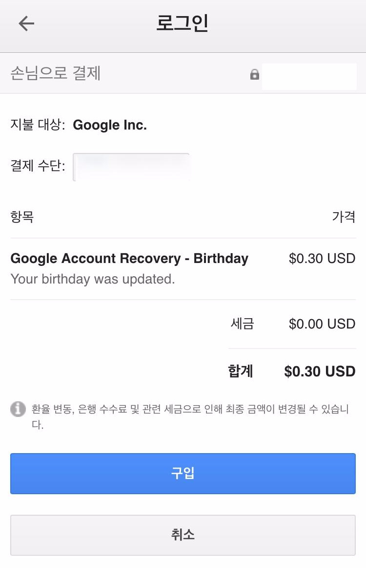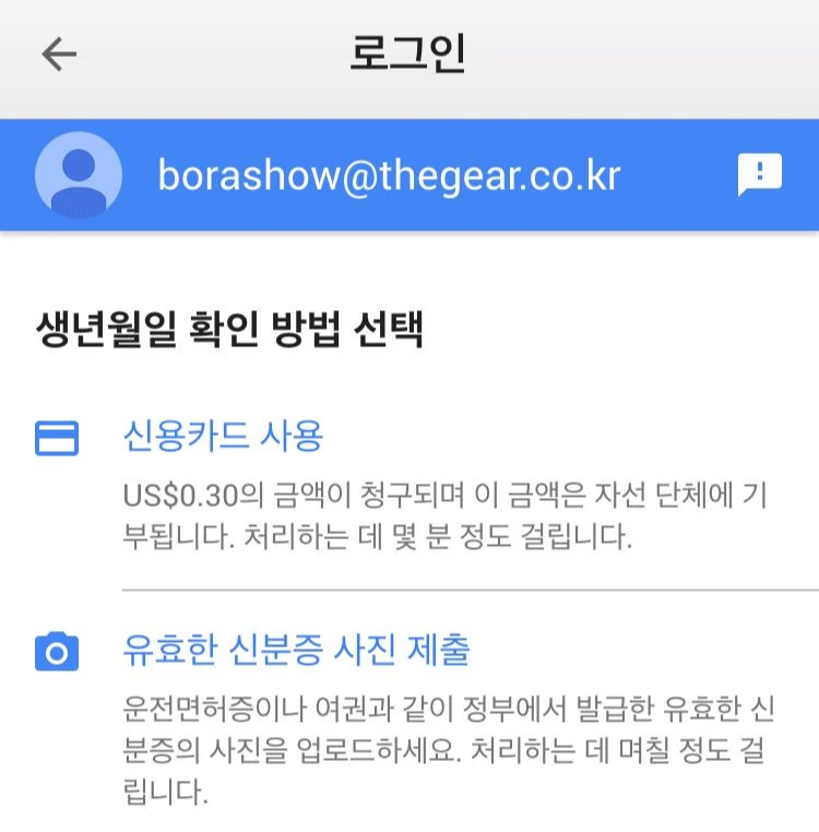 10. 다행히도 구글은 두 가지 방법이 있다고 했다. 신용카드로 0.3달러 (300원 조금 넘는 금액)를 결제하거나 신분증을 내면 내가 구글 앱스를 쓸 수 있는 사람이란 걸 확인하겠다고 했다.