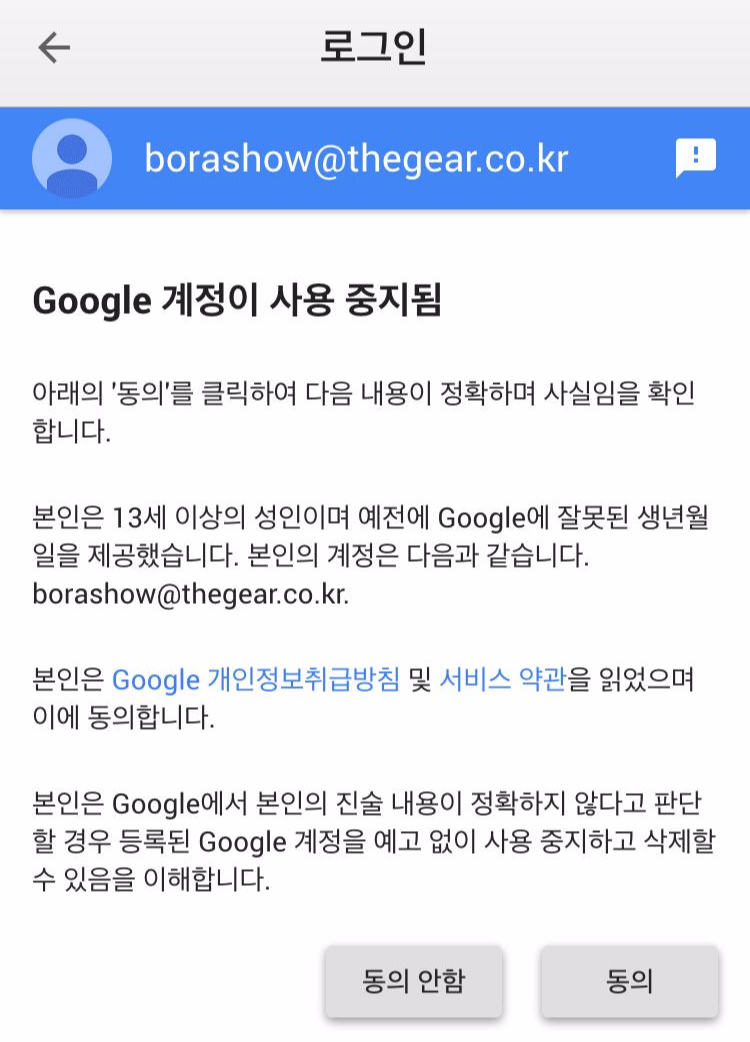 구글 앱스여서 방심했는데 구글은 구글 앱스에도 14세 미만 회원가입 불가 정책을 고수했다. 귀찮다며 모든 걸 제일 첫 항목으로 선택한 내 잘못... 생년월일을 왜 줘야 하는지 여전히 의문이지만.
