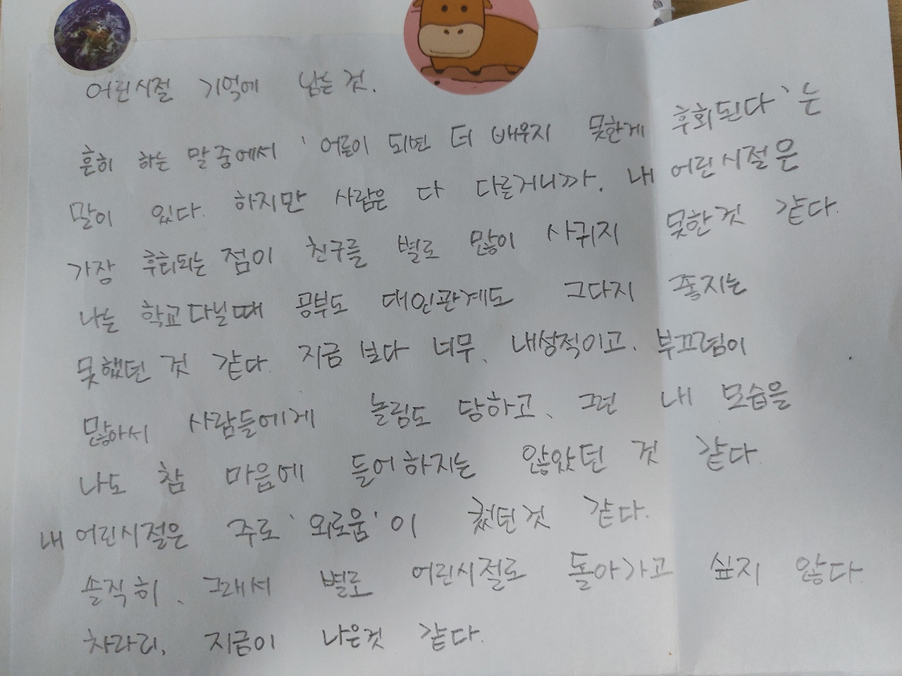 이제 글쓰기수업을 들은 지도 무려 4년이 지났다. 아래 사진은 글쓰기수업에서 내가 맨 처음으로 쓴 글이다. 무언가를 잘 버리지 못하는 나의 습성? 때문에 아직도 가지고 있다. 그리고 브런치는 4수 만에 합격했다. 내가 이 정도라도 글을 쓰게 된 건 글쓰기 선생님의 도움이 크다. 정성이 가득한 수업에 감동한 적이 많다. 글쓰기 선생님께 가장 고마운 점은 그동안 나의 글이 누가 봐도 별로인 적이 많았는데. 솔직하고 구체적으로 어떤 점을 개선해야 할지 알려주신 점이다. 솔직히, 적당히 잘 썼다고(?) 해주고 넘어가도 되는데 그렇게 자세하게 알려주셔서 내 글이 나아졌다고 생각한다.^^
