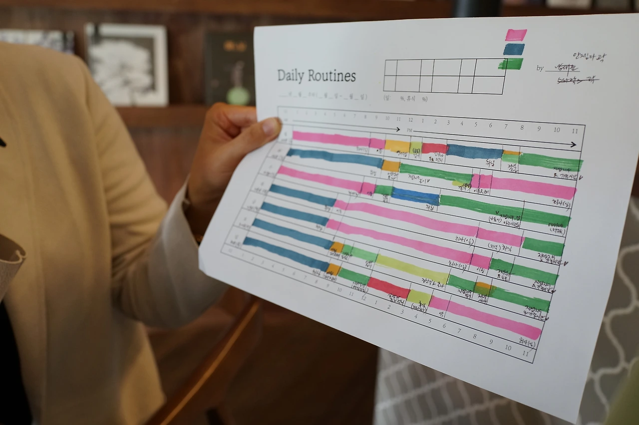 "저는 일주일이 제가 해야 하는 수업으로 꽉 차 있어요. 그리고 집안일과 육아로도 늘 바빠요. 저는 아주 심플하게 제 일상을 정리해보고 싶었어요. 나를 위한 미타임(me time)을 분홍색으로 표시했는데, 이 시간을 더 많이 확보해보는 게 제 도전이에요. 저는 배우는 것을 좋아하고 사람들을 만나는 것을 좋아해요. 혼자 영화 보는 것도 나쁘지 않고요. 이런 시간을 일주일에 넣어보며, '지금 내가 나를 위해 무언가를 하고 있구나'하고 느끼며 살고 싶어요. 아무리 내 일상에 회색이 많아도 나에게는 나를 위한 핑크가 있다고 느끼면서요."