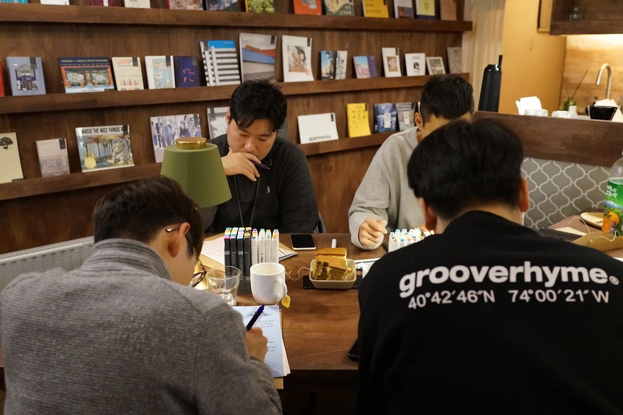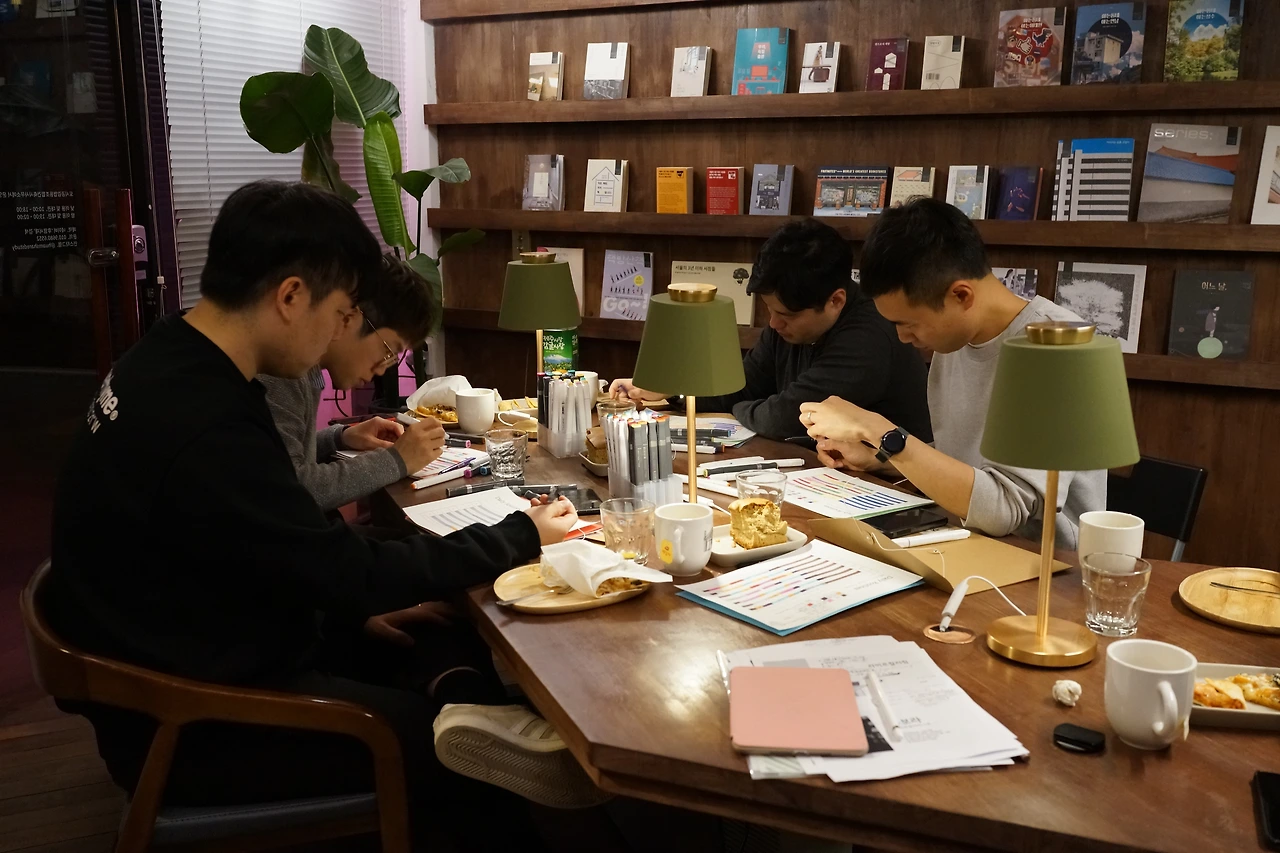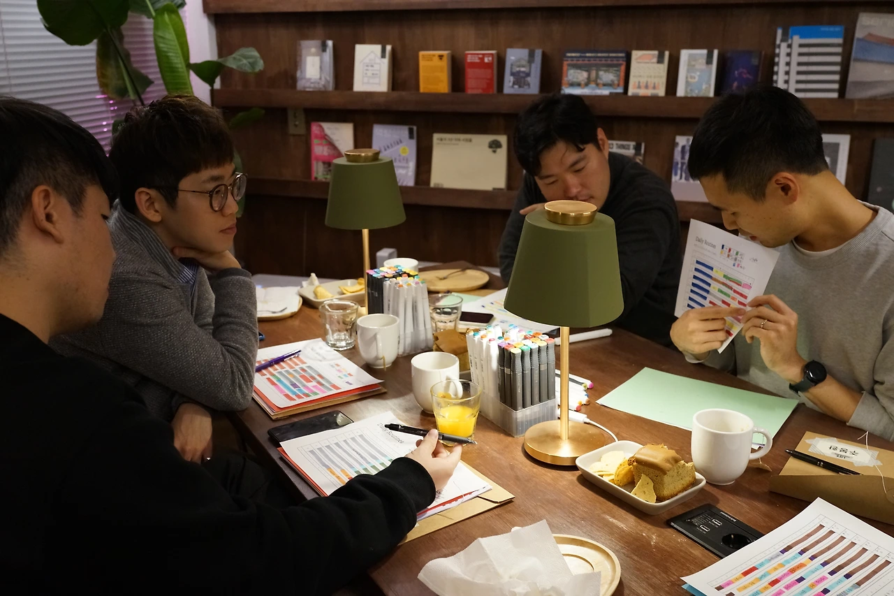 분위기가 사뭇 진지하죠. 어제 꽤 의미 있고 재미있는 모임이 있었습니다. 라이프 컬러링 첫 남성 참가자들과의 모임. 특별히 초대한 남성 4분과 함께 일상으로의 여행을 떠났습니다. 퇴근을 마치고 후암 서재로 달려온 직장인과 프리랜서. 피곤한 몸을 이끌고 온 늦은 저녁 시간이었지만, 그 열기는 어느 때 보다 뜨거웠습니다. 무려 3시간 동안 나의 일, 일상, 휴식에 대한 이야기를 나누었습니다.
