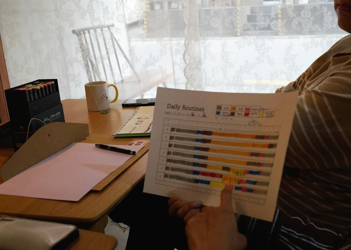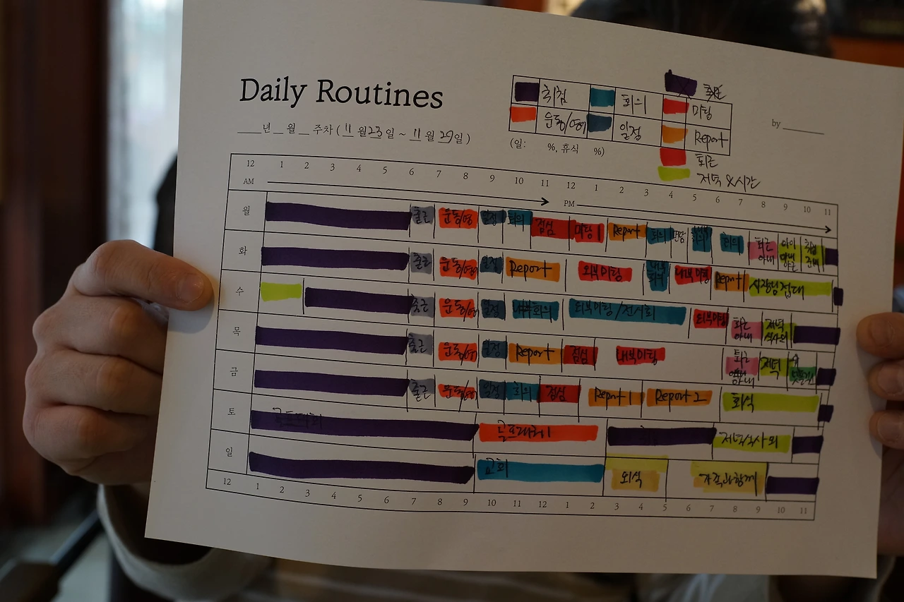 나: 일상을 구분하신 카테고리가 취침/회의/미팅/운동/일정/리포트/저녁 이렇게 구분된 것이 인상적이에요. 하루 전체가 일과 연결된 느낌도 들고요. 보통 일상을 살펴보면 힘들었던 회식 따로, 가족들과의 저녁 시간 따로 구분하는데 저녁 식사시간이 전부 같은 색으로 통일된 것도 독특해 보이고요. 따로 이유가 있으신가요?