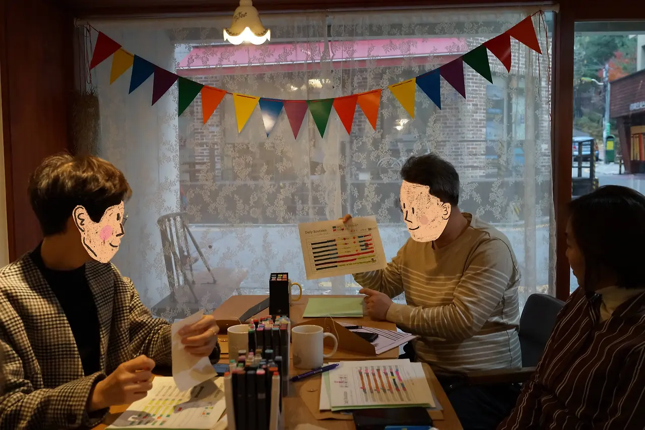 라이프 컬러러 1: (침묵) 저도 이걸 다 그리고 나서야 알았어요. 제 일상에는 제 시간, 업무시간, 가족과의 시간 경계가 모호해요. 그래서 제가 그동안 힘들었던 것 같고.. 가족들도 힘들었을 것 같아요.