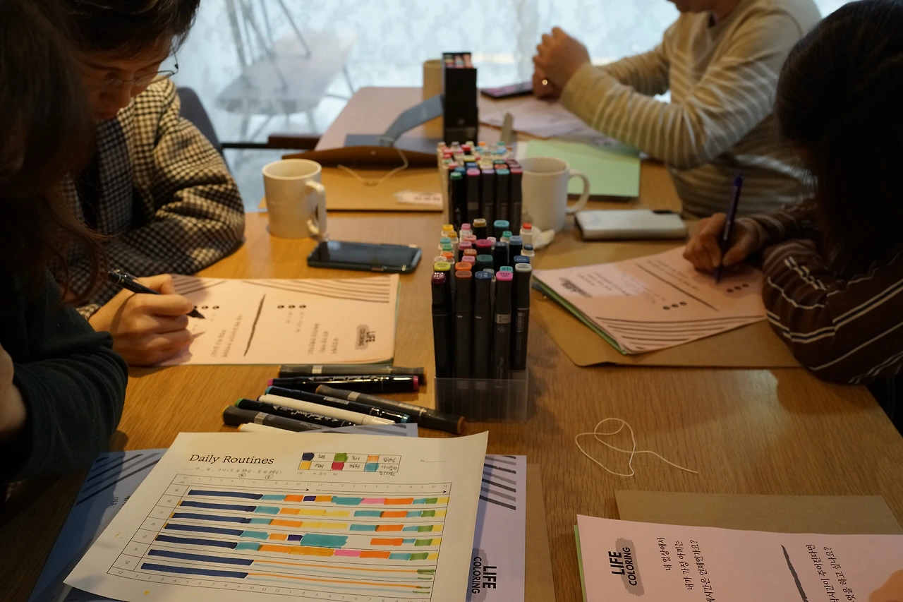 라이프 컬러러 2: 우선 저를 위한 독서를 해보고 싶어요. 그리고 직장에 다니는 친구들과 점심 약속을 잡아 친구들과 밥도 먹고 싶고요. 저는 뭔가 쌓일 때 대화하면서 풀면 좀 마음이 편해진다는 것을 발견했어요. 그런 시간을 저에게 좀 만들어 주고 싶어요.