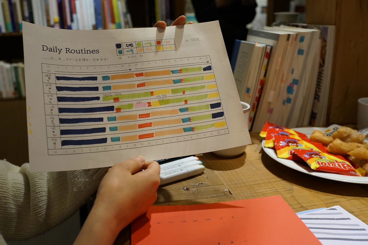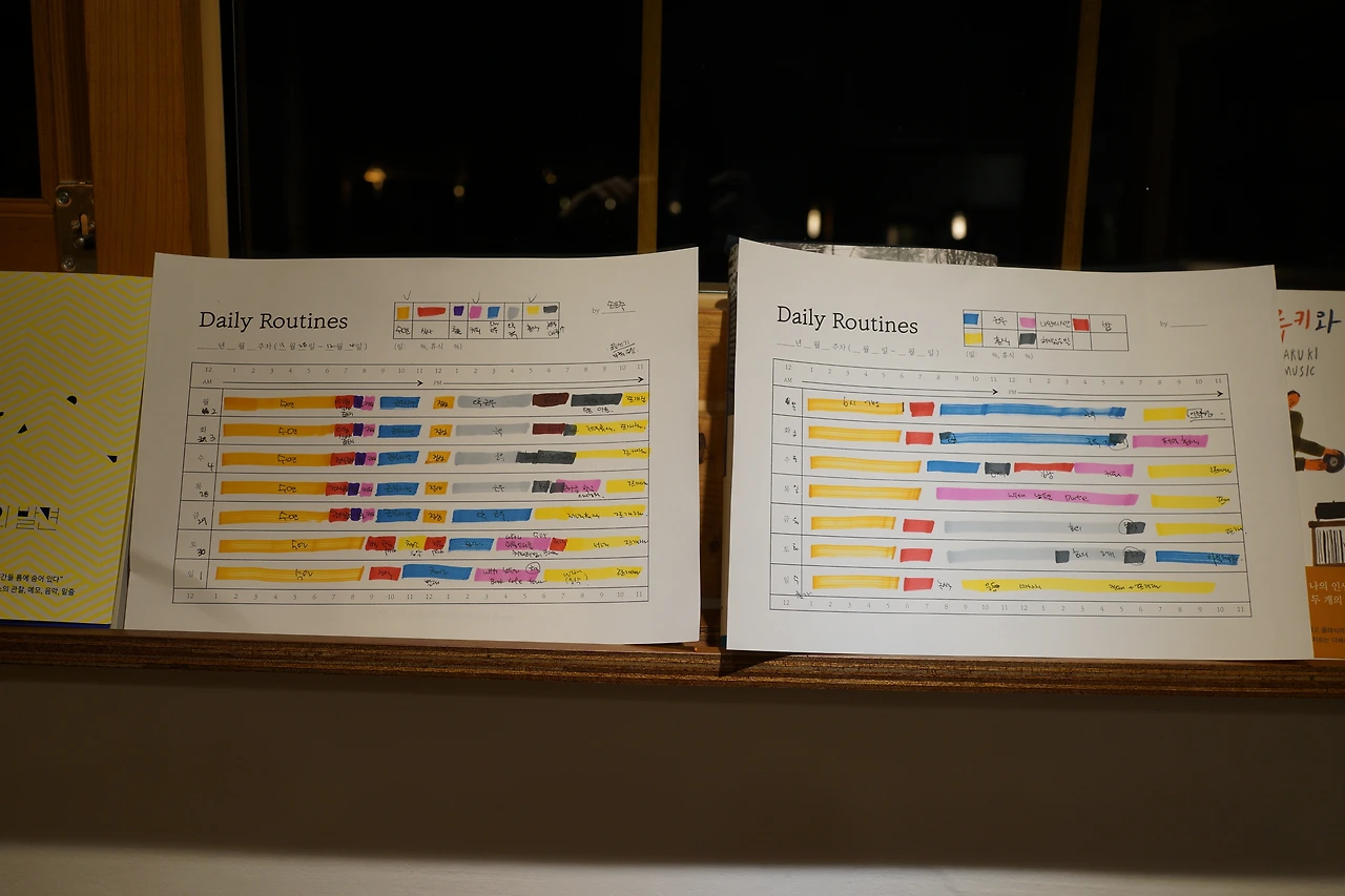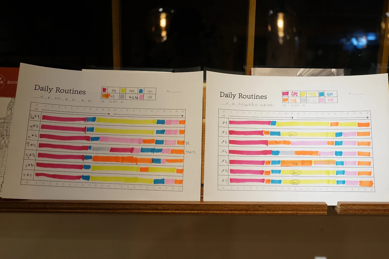 똑같은 6개의 카테고리, 7일이라는 칸 안에 채워지는 일상의 모습인데
