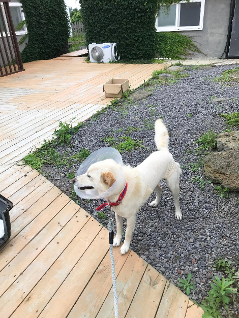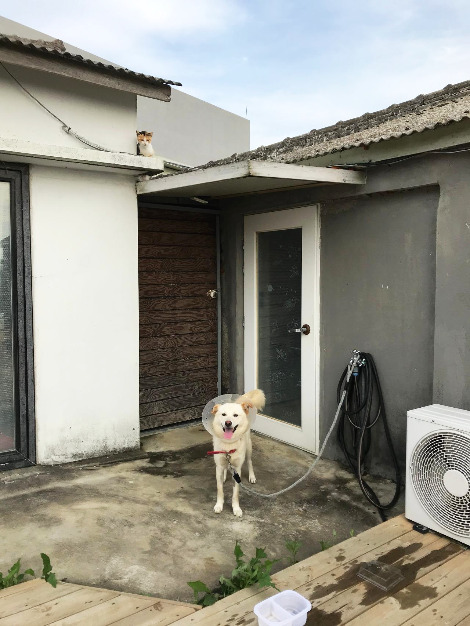 집에 돌아오니 고양이가 승애집 문 앞에 떡하니 앉아 있었다. 마치 어서 오라는 듯. 우리는 보리가 들어가 있는 켄넬을 둘이 영차영차 들고 왔는데, 우리가 들어와도 놀라는 기색도 없었다. 고양이가 놀라 움직인 건 켄넬 안에서 보리가 나온 다음이었다. 보리는 마취도 덜 풀리고, 한 시간 동안 차 안에서 고생한 터라 밖에 나와서도 정신이 덜 차려져서 고양이가 눈에 들어오지 않았겠지만, 고양이는 의외의 동행에 놀라 금세 있던 자리에서 달아났다. 하지만 멀리 가지는 않고 마당에 깔린 데크의 끝 부분에서 보고 있었다. 정말 이제 마당 고양이가 되었나 보다. 개가 나타나도 없어져버리지 않고 마당에 있다니.