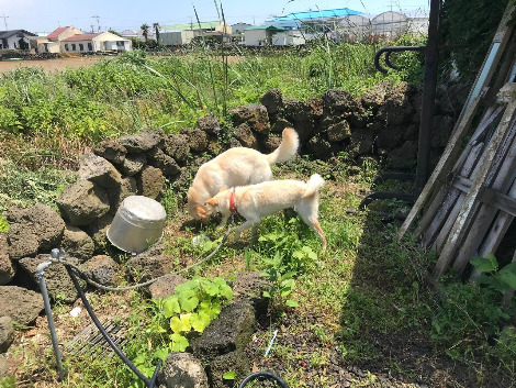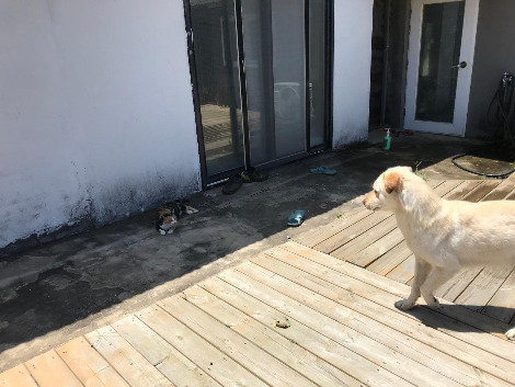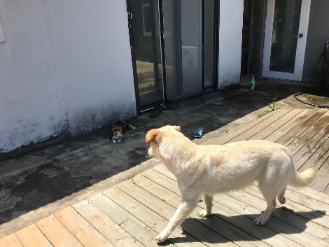 아이비를 집에 데려다주고, 무무 중성화 수술한 자리를 소독해 주고 싶었지만 저녁에 짧게라도 산책을 시킨 후에 해 주기로 하고, 보리는 마당 그늘에 두고, 고양이는 두 마리 강아지에게 번갈아가며 털을 세우고 하악질을 하느라 바쁘더니 익숙해졌는지, 안정이 되었는지 자리를 잡아 쉬고 있었다. 이렇게 개들이랑 실랑이를 하고, 고양이까지 마당을 돌아다니고 있으면 정말 동물농장이 따로 없다는 생각이 든다.
