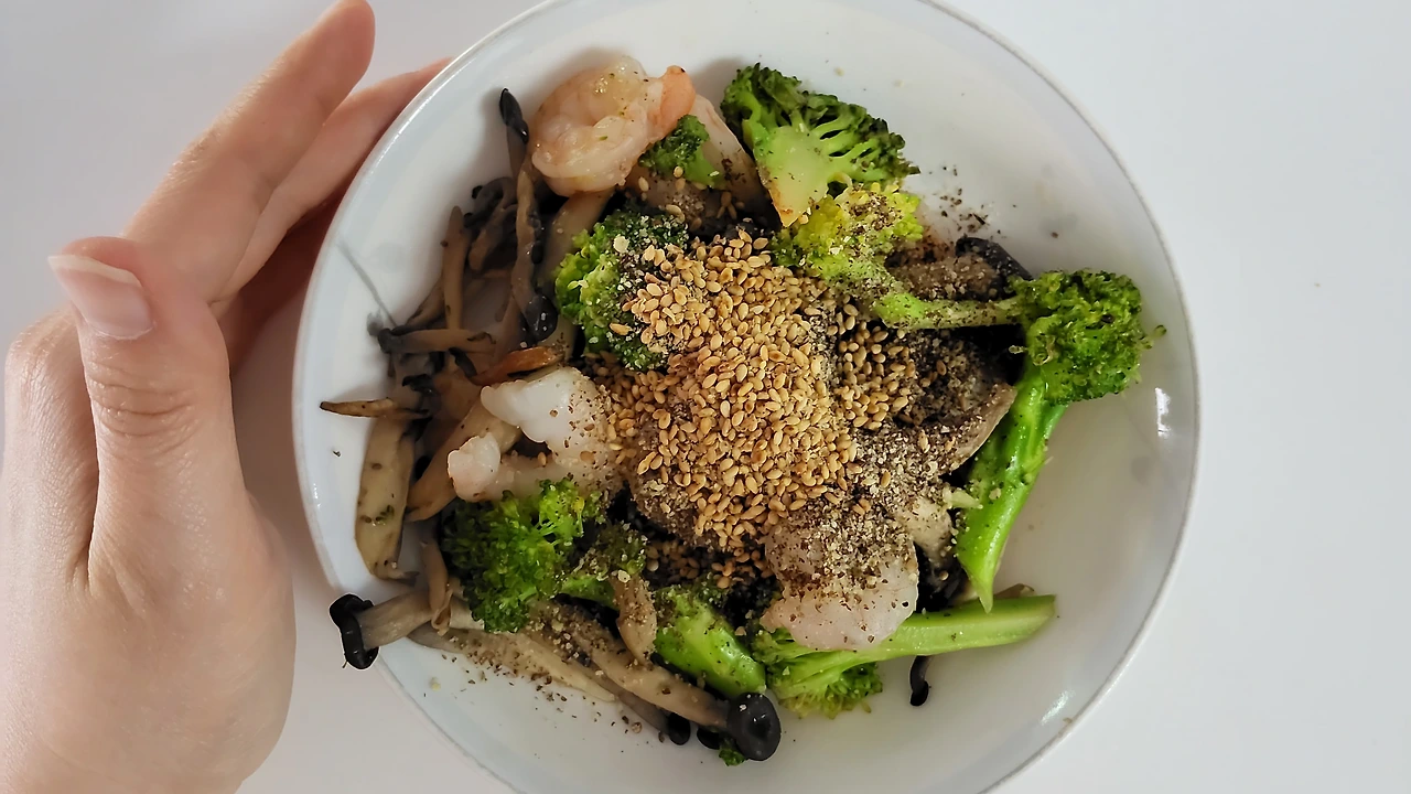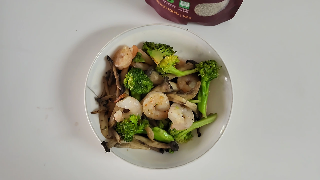 브로콜리에 비타민 C가 많이 함유되어 있다 하여 요즘 요리에 많이 넣어 먹고 있다. 찜은 아니고 버섯과 브로콜리를 깨끗하게 씻은 뒤, 소금 후추 간을 해주고 맨 마지막에 새우를 넣어서 볶아준다. 볶는 순서는 보통 질기고, 딱딱하고, 잘 익지 않는 재료부터 넣어주면 된다. 볶음이든 찌개든 순서는 대체로 같다. 맨 마지막엔 들깨나 깨 가루를 뿌리고 밥과 함께 먹어주면 그럭저럭 건강식이다.