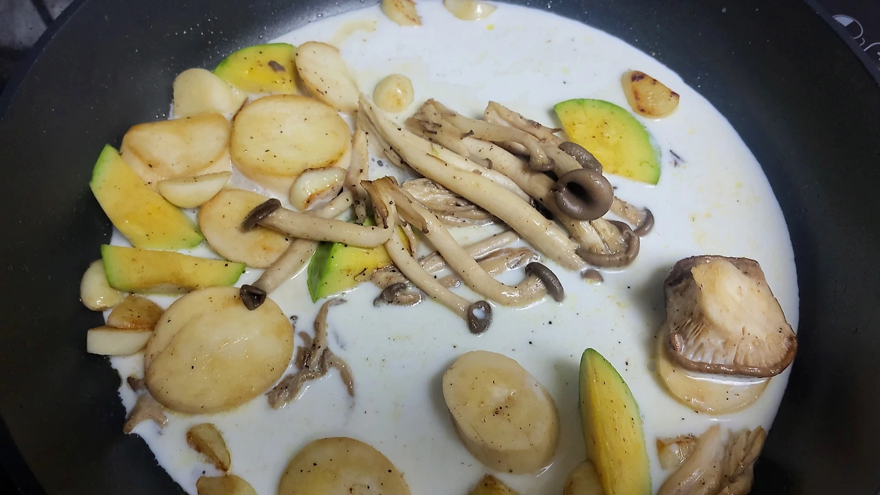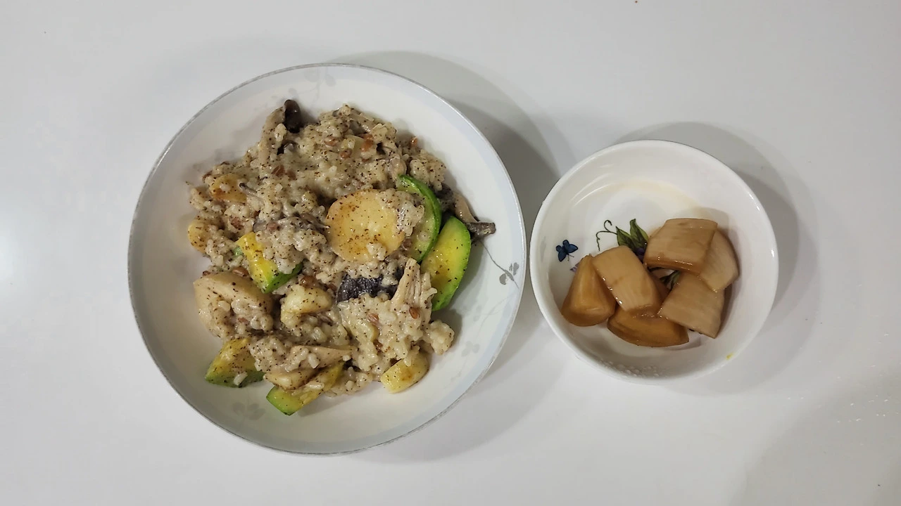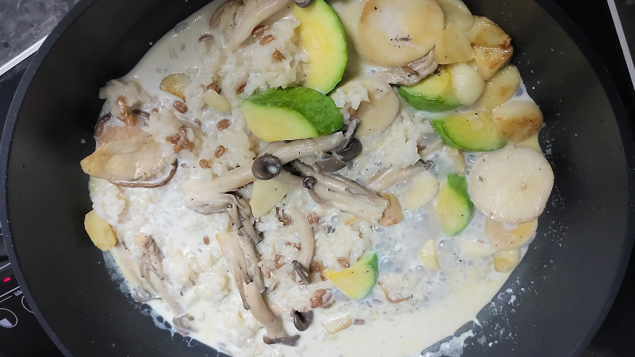 크림소스 없이 우유, 버터, 소금만 넣어도 괜찮다. 마늘 먼저 버터에 살짝 굽고 그 이후에 야채, 버섯을 볶은 다음에 우유와 밥을 넣어준다. 조금 밍밍할 수 있는데 채소에서 물이 나오기 때문에 우유를 더 졸여주는 게 좋다. 감칠맛이 덜 난다면 고기를 넣고, 깔끔하게 드시고 싶으시면 해산물 추천.