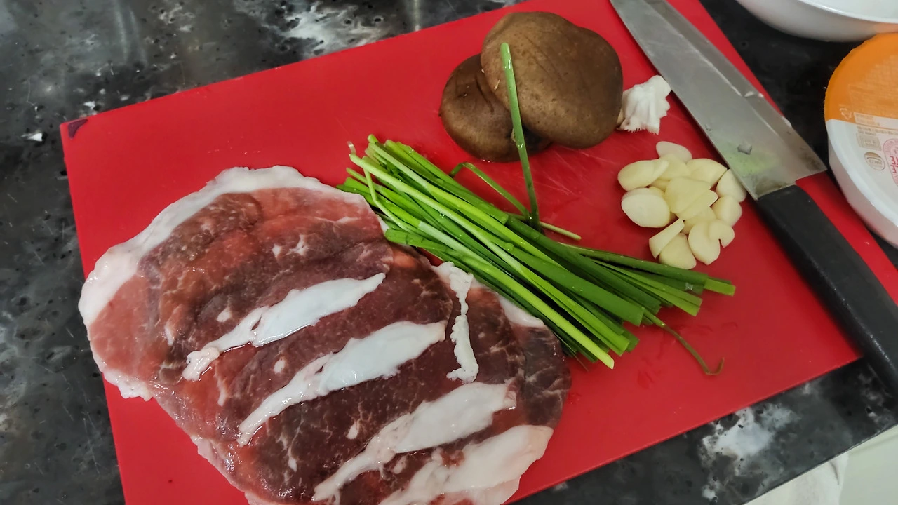 부추, 표고버섯 2-3개, 차돌박이, 계란 1개, 마늘, 맛술, 간장, 후추, 올리고당