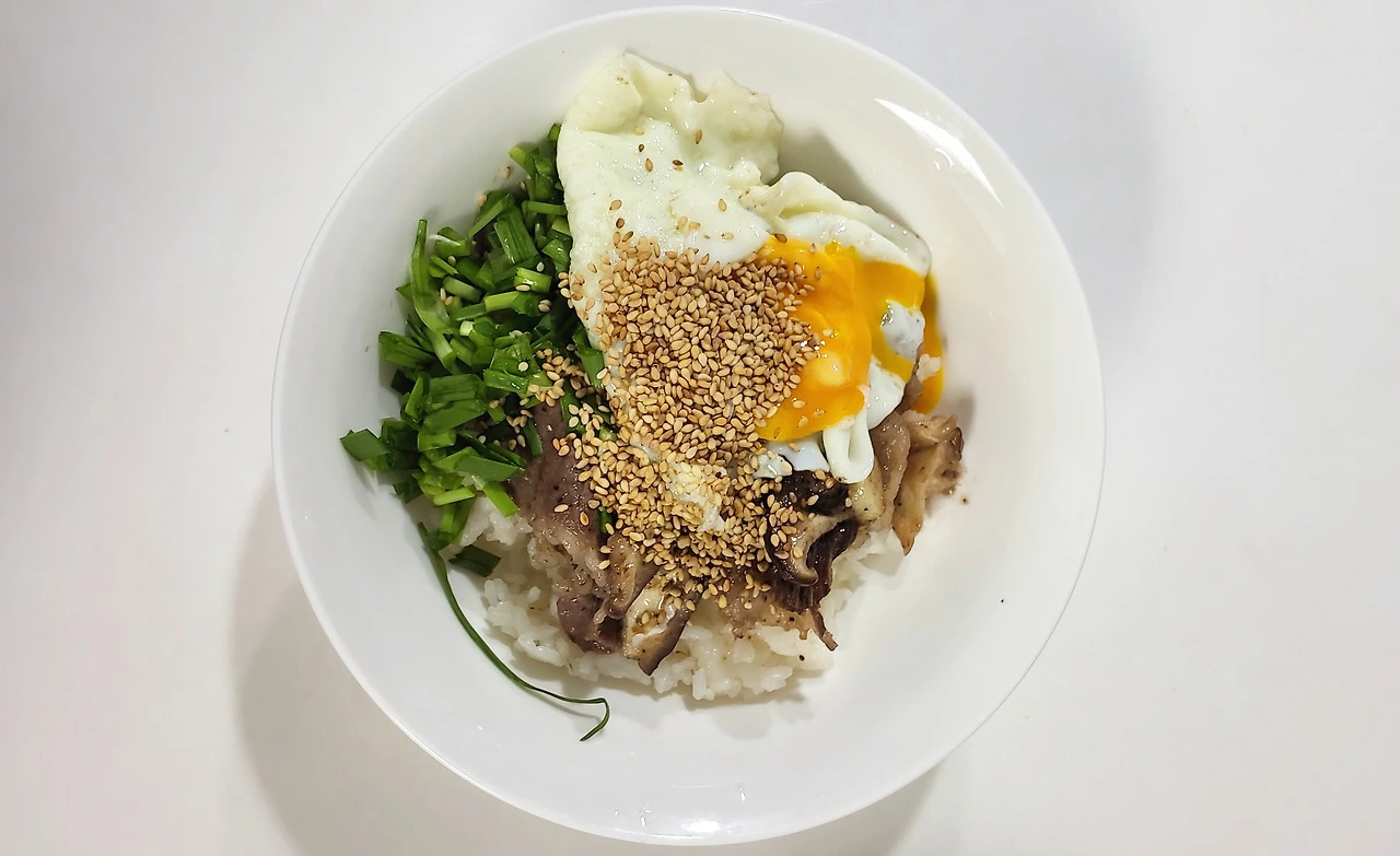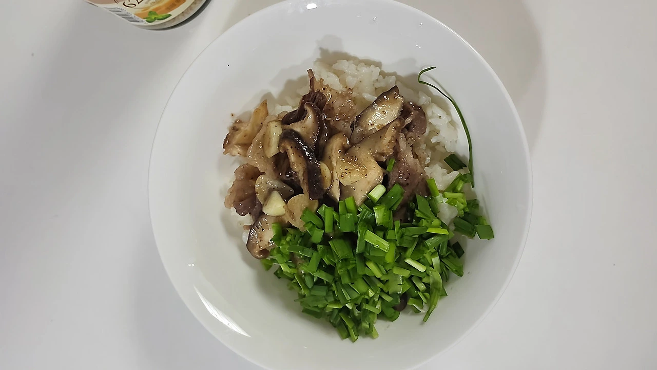 차돌은 너무 오래 구우면 뻑뻑해지니 적정히 굽고, 간장이나 올리고당 넣기 전에 고기에 밑간으로 후추를 뿌리고 난 다음 간을 맞추면 좋다. 마늘은 초반부터 센 불로 볶으면 타니 간하고 나중에 넣고, 마지막은 표고버섯을 살짝 볶은 뒤 마무리하면 된다. 다 된 차돌볶음은 밥 위에 얹고, 그 위에 부추와 계란 그리고 깨를 올려주면 끝.