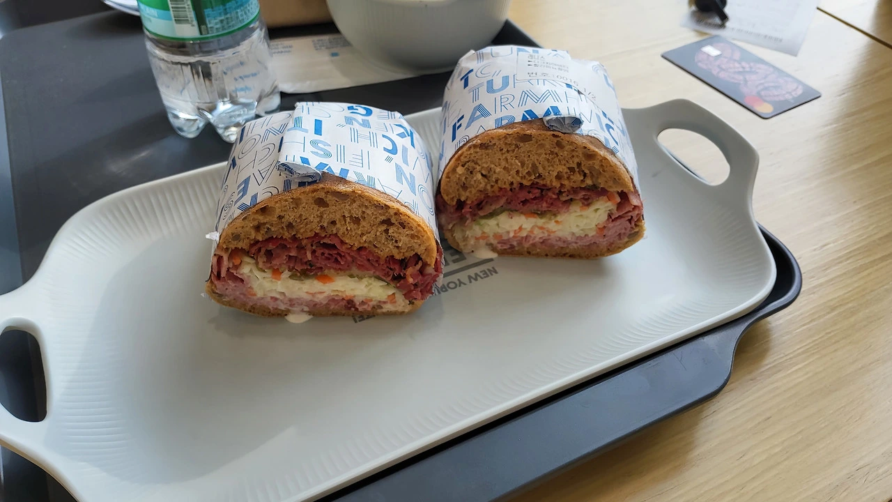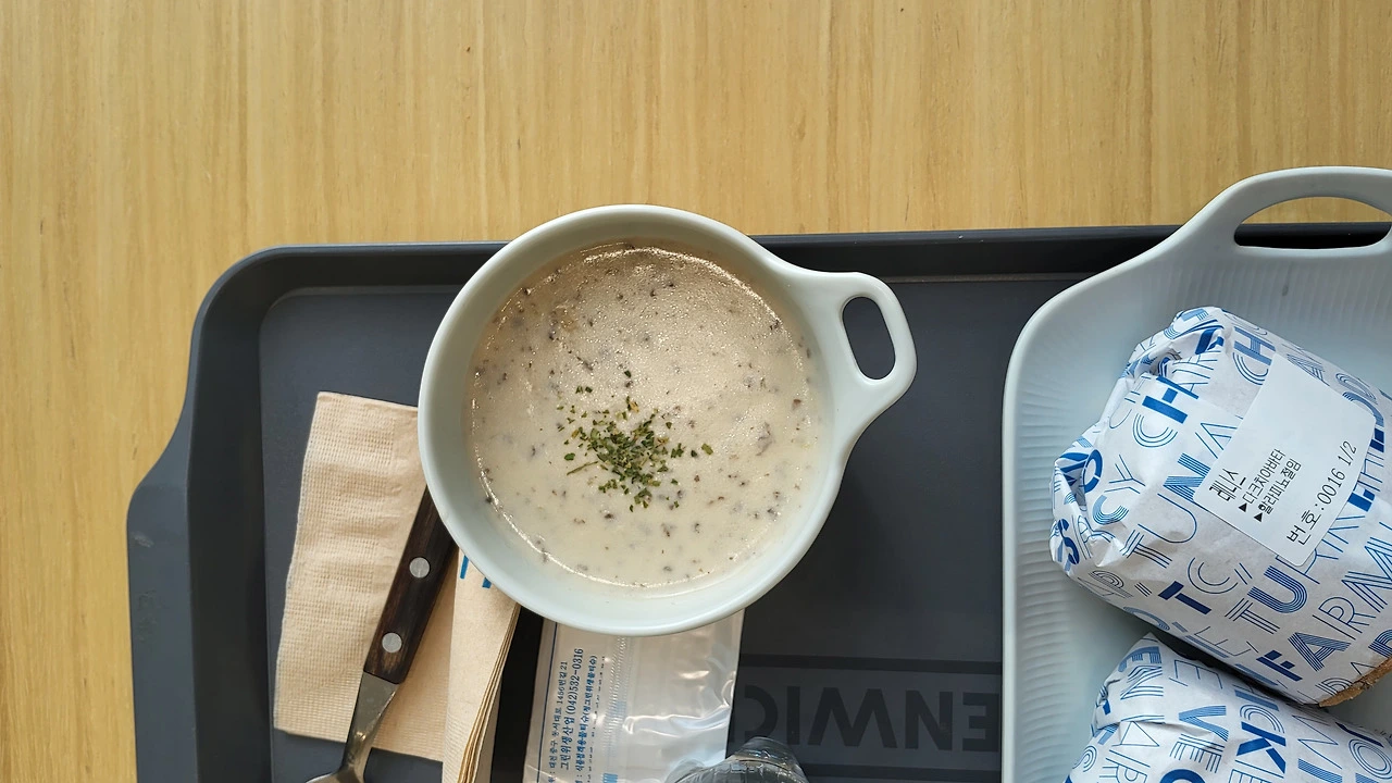 가격대는 총 20,000원이었고, 솔직히 조금 비싸다고 생각했다. 아마 다음에 오진 않을 것 같고, 다행히 음식은 맛있었다. 보통 샌드위치는 생 샐러드 같은 양상추 류가 많이 들어가는데, 신기하게 코운슬로가 들어가서 새로웠다. 기대를 아예 안 했는데 생각했던 것보다 맛있었고 느끼하지 않았다. 음료는 커피, 주스, 물 이렇게 고를 수 있는데 탄산수 씨그램을 골랐다. 샌드위치에 고기가 많이 들어가면 느끼해서 가급적이면 탄산수나 물을 먹는 편이다. 커피는 일주일에 1-2번으로 극단적으로 줄인 상태라서 소량만 마신다.